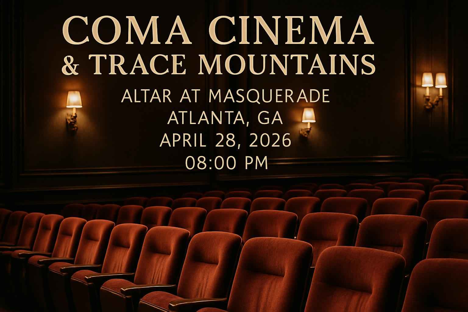 Experience Coma Cinema and Trace Mountains live at Altar at Masquerade in Atlanta GA on April 28 2026 at 8 PM. This highly anticipated concert event draws indie music fans across Georgia searching for exclusive coupon codes and official event details. Secure your spot at Masquerade with verified promo codes from RSVP Event Agency and gain access to unbeatable ticket savings for Coma Cinema and Trace Mountains.
