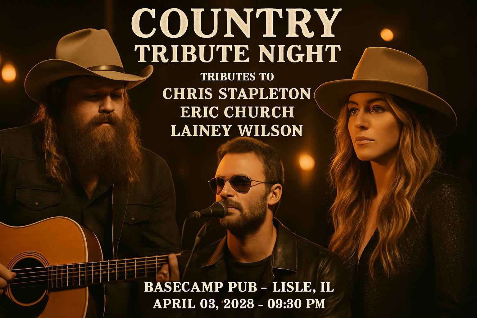 Experience live tribute performances honoring Chris Stapleton Eric Church and Lainey Wilson at Basecamp Pub in Lisle IL for one night only.