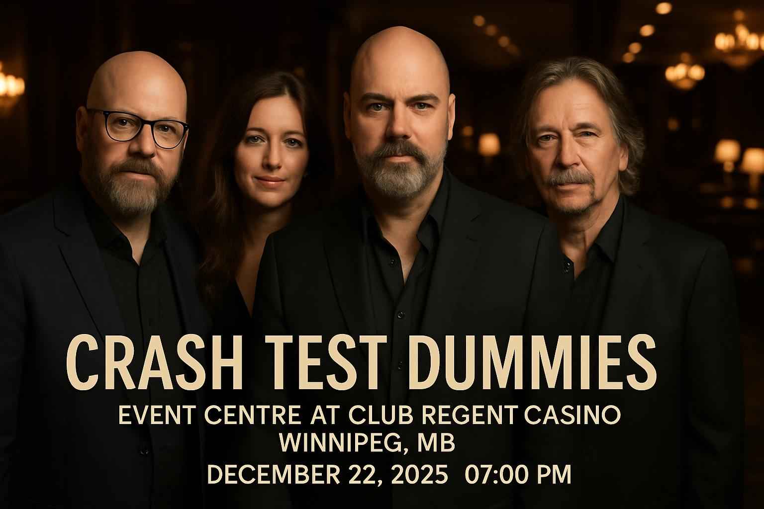 The Crash Test Dummies concert at Club Regent Casino’s Event Centre delivers an evening of classic hits and unforgettable performances. Located in the heart of Winnipeg MB this venue offers excellent acoustics and convenient access for music fans. Doors open at 7 PM on December 22 2025 making it a perfect winter event for both locals and visitors searching for top live entertainment in Winnipeg.
