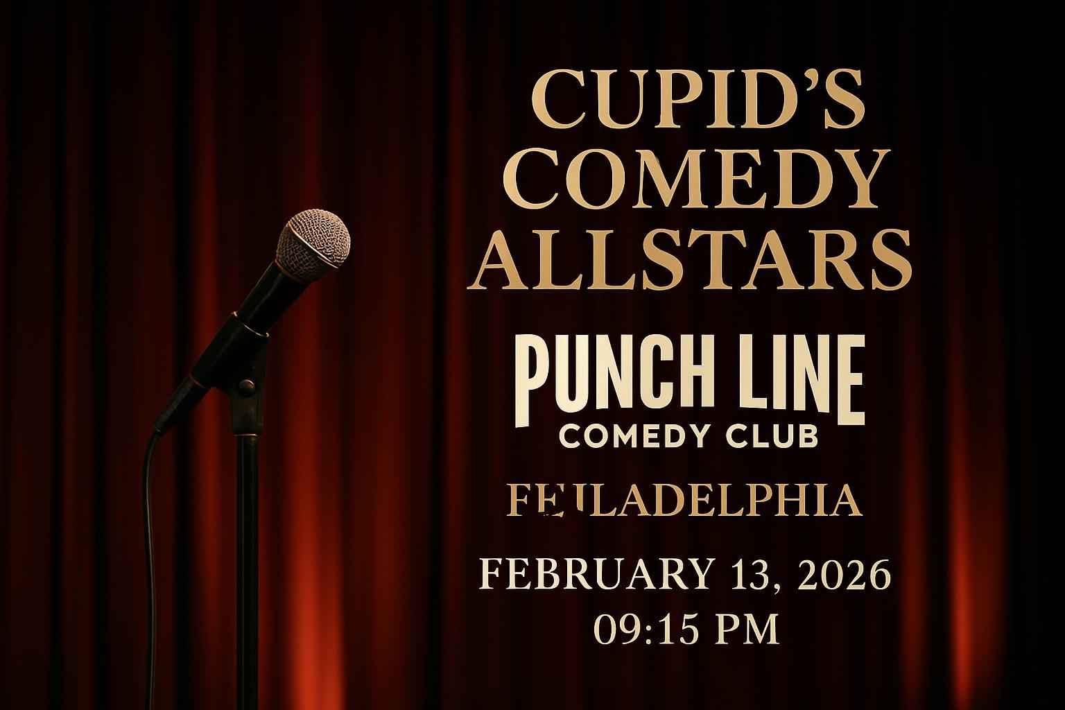 Cupid’s Comedy Allstars begins at 915 PM on February 13 2026 at Punch Line Comedy Club in Philadelphia PA.