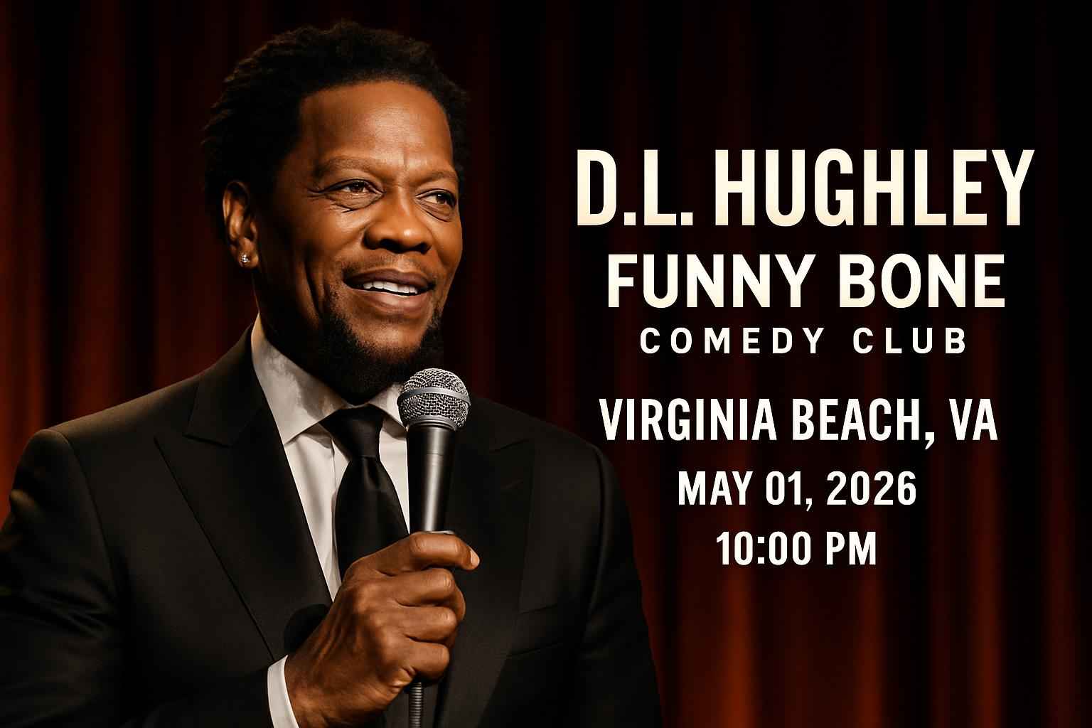 Experience D L Hughley live at the Funny Bone Comedy Club in Virginia Beach on May 01 2026 at 10 PM. Secure your spot for a night of laughter with one of Americas top comedians. Find top-rated promo codes and exclusive discounts for D L Hughley Virginia Beach shows through RSVP Event Agency. Enjoy a premier comedy experience while saving on tickets with trusted coupon codes used by local fans.