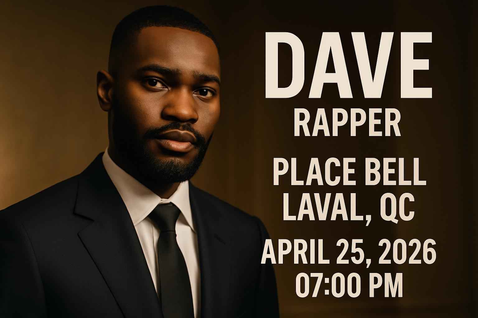 Experience UK rap sensation Dave live at Place Bell in Laval QC on April 25 2026 at 7:00 PM. RSVP Event Agency delivers exclusive Dave rapper Laval ticket promo codes and up-to-date event info for fans searching to secure the best deals and memorable live music experiences in the Greater Montreal area.
