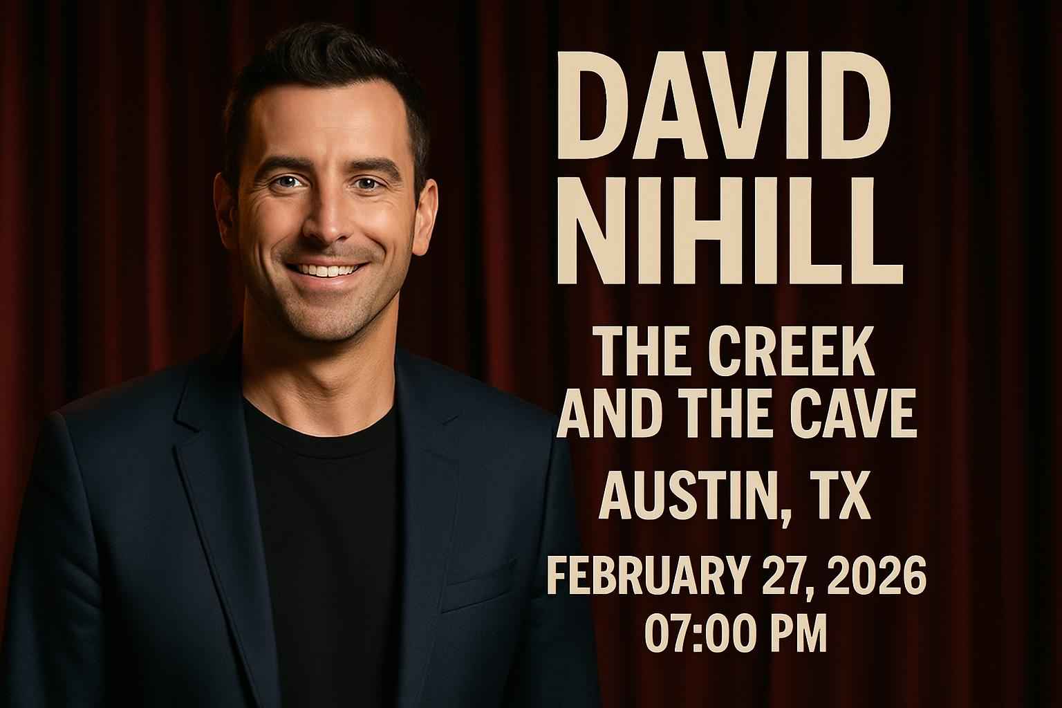 David Nihill brings his acclaimed stand-up to The Creek and The Cave located in the heart of Austin TX. As a leading voice in comedy David Nihill delivers sharp wit and engaging storytelling. The event is scheduled for February 27 2026 with doors opening at 7 PM. Enjoy a memorable night in one of Austin’s most popular comedy venues. This show is highly anticipated and attracts fans searching for David Nihill tickets Austin TX The Creek and The Cave events and Austin comedy show promo codes.