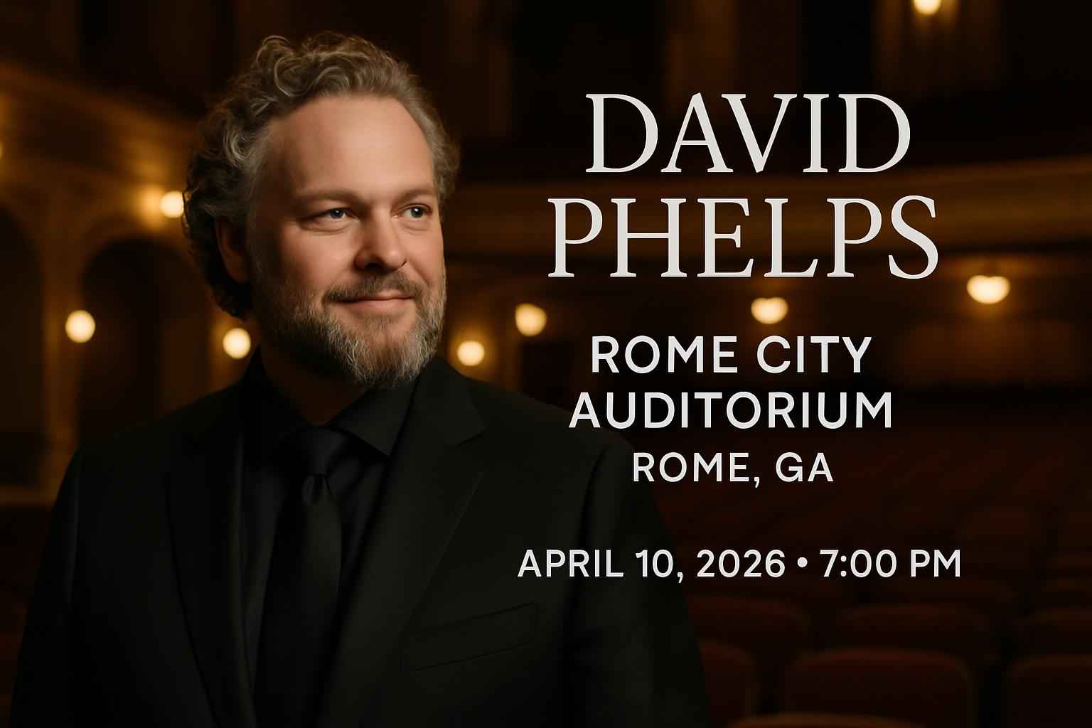 David Phelps brings his powerful voice and signature sound to Rome City Auditorium on April 10 2026. This Rome GA concert features live performances of acclaimed Christian and gospel hits in a venue celebrated for its rich acoustics and local charm. Arrive early to enjoy seamless entry and the full concert experience in downtown Rome.