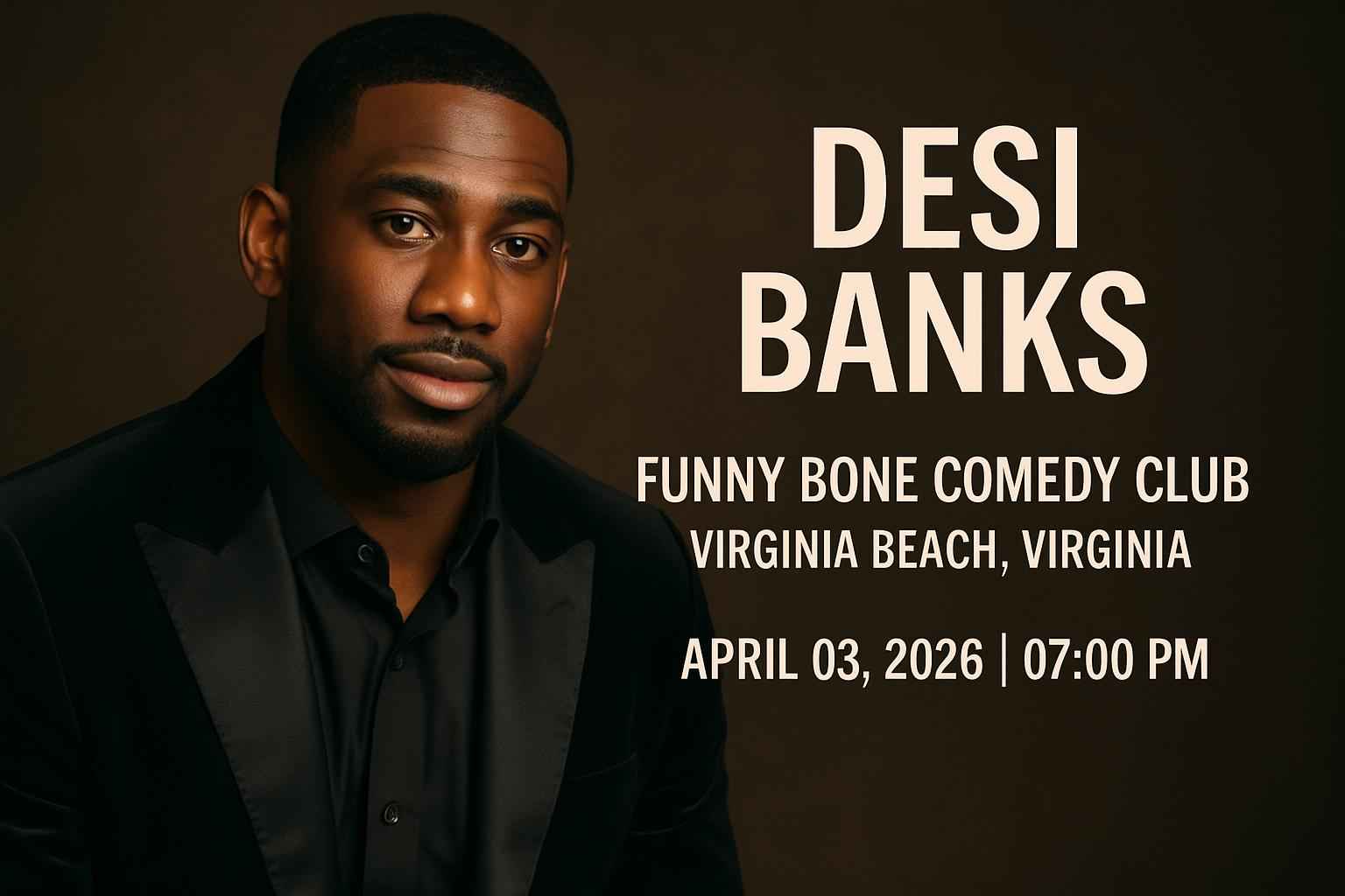 Desi Banks is set to deliver an unforgettable performance at the Funny Bone Comedy Club located in the heart of Virginia Beach Virginia. The show begins at 0700 PM on April 03 2026. Fans searching for live comedy in Virginia Beach will enjoy Desi Banks signature humor and crowd engagement. Secure your tickets using exclusive promo codes from RSVP Event Agency and enjoy top-rated entertainment at a value price.