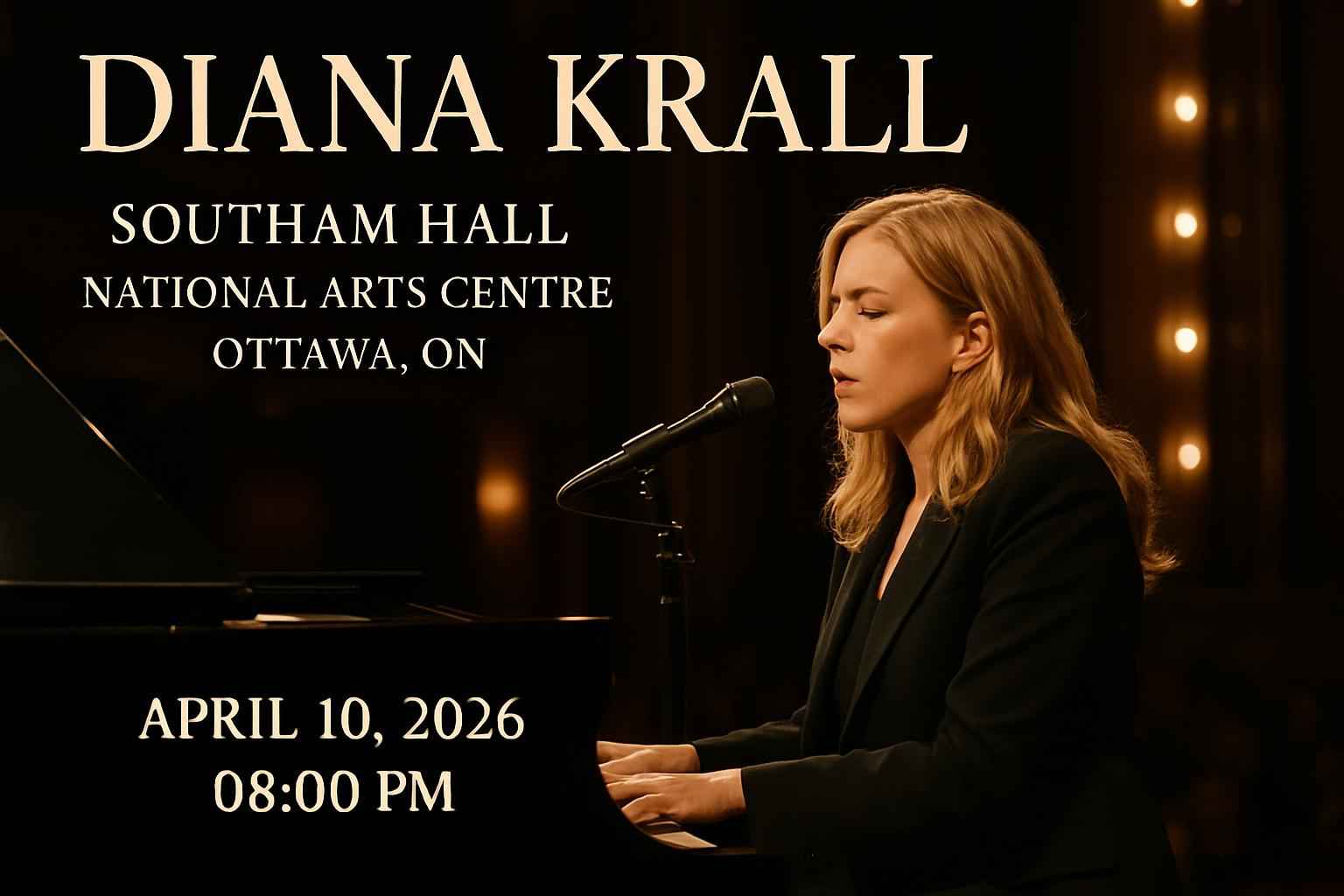 Diana Krall takes the stage at Southam Hall National Arts Centre Ottawa ON on April 10 2026 starting at 8 PM. Enjoy an intimate evening of jazz classics and chart-topping hits in one of Ottawas best live music venues. The National Arts Centre is centrally located with easy access to parking and public transport making it the top choice for Ottawa event-goers. Secure the best seats by booking your tickets early.