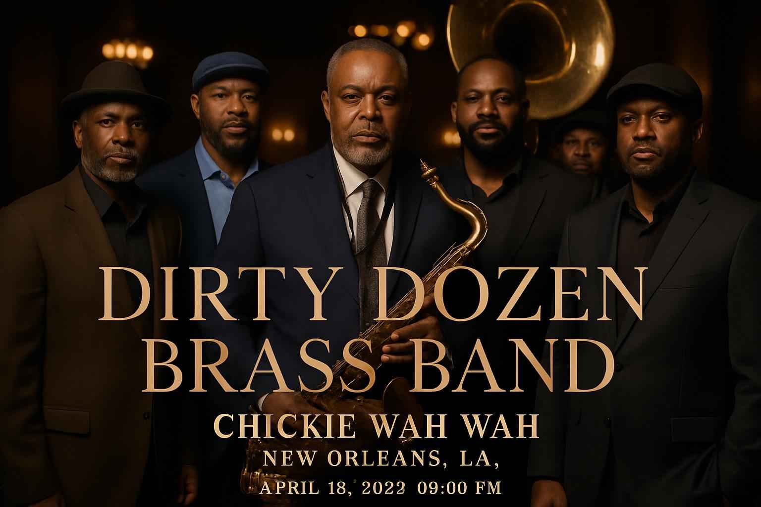 Experience the legendary Dirty Dozen Brass Band live at Chickie Wah Wah in New Orleans LA on April 18 2026 at 9 PM. This show delivers authentic New Orleans jazz energy and world-class musicianship in one of the citys top live music venues. Secure exclusive Dirty Dozen Brass Band coupon codes and promotional discounts through RSVP Event Agency to guarantee the best value for your night out in NOLA.