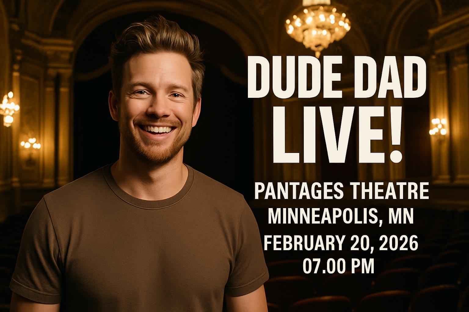 Dude Dad Live! begins at 7 PM on February 20 2026 at Pantages Theatre in Minneapolis MN. Plan to arrive early for best seating and parking options.