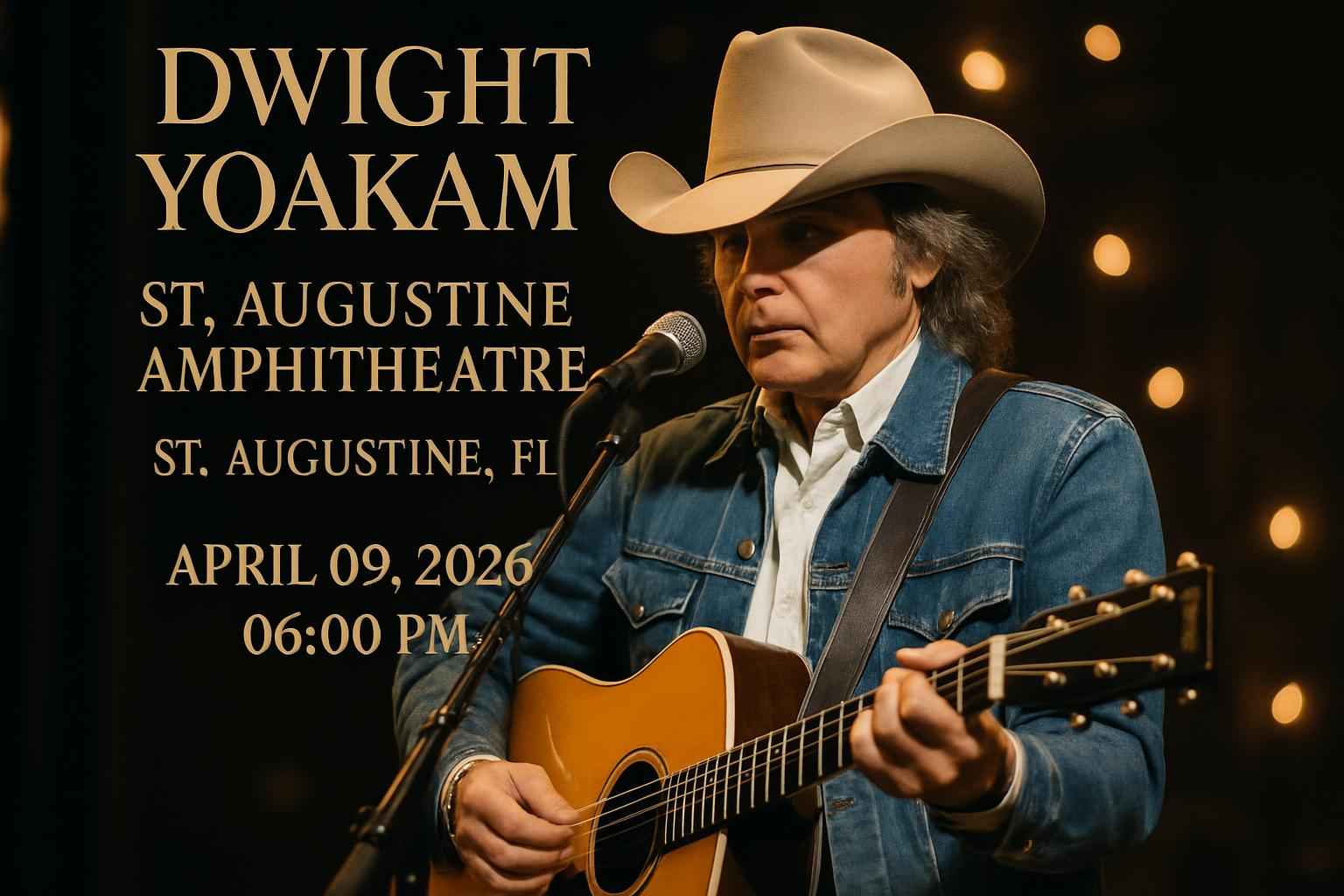 Experience country music icon Dwight Yoakam live at the St. Augustine Amphitheatre in St. Augustine FL on April 09 2026 at 0600 PM. Secure exclusive Dwight Yoakam St. Augustine Amphitheatre promo codes through RSVP Event Agency for the best ticket prices. This concert promises top hits and unforgettable performances in a renowned Florida venue drawing fans from Jacksonville Daytona Beach and Palm Coast. Discover event details seating maps and verified coupon codes for instant ticket savings today.