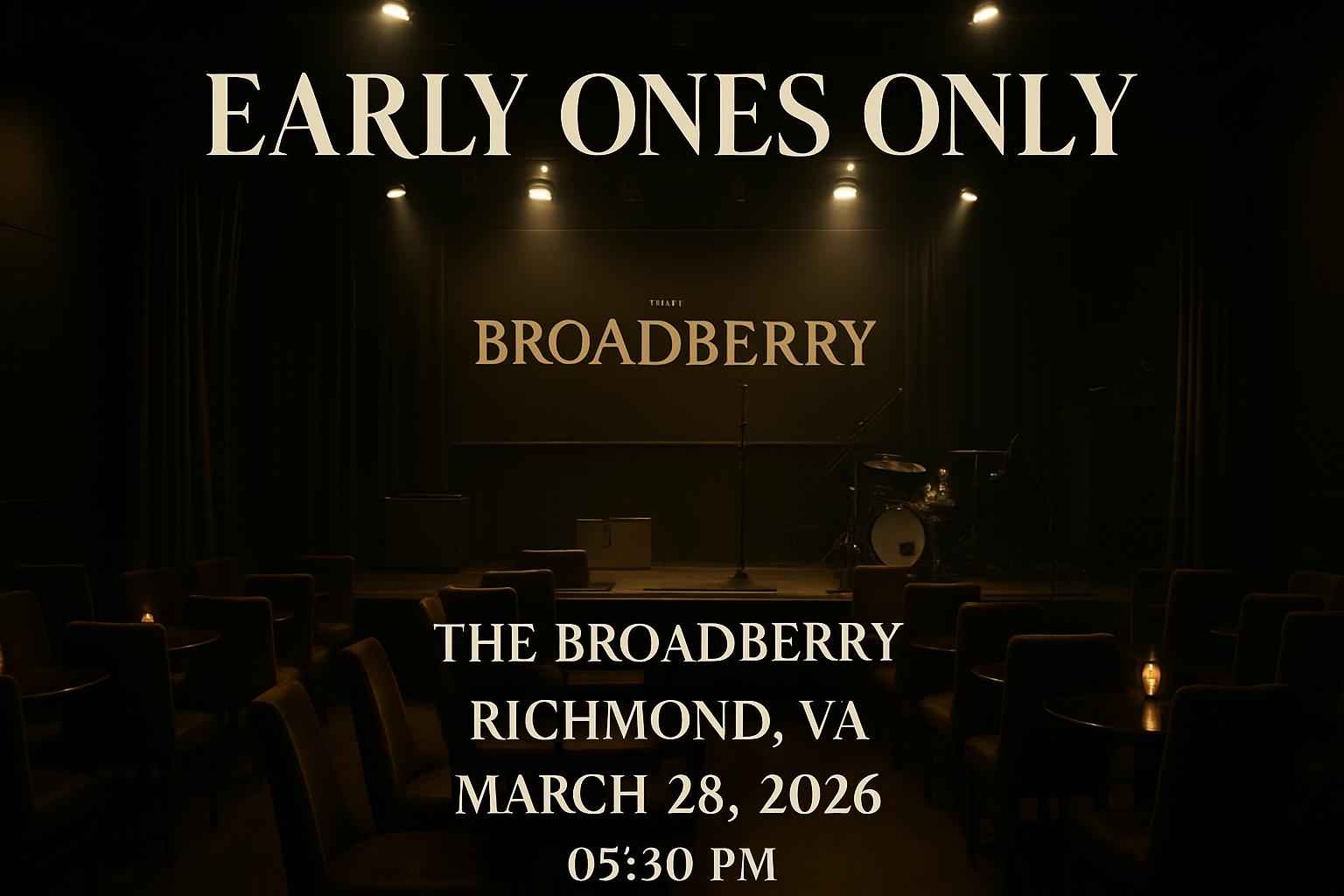 Early Ones Only begins at 0530 PM on March 28 2026 at The Broadberry in Richmond VA Arrive early for the best experience and to secure your spot