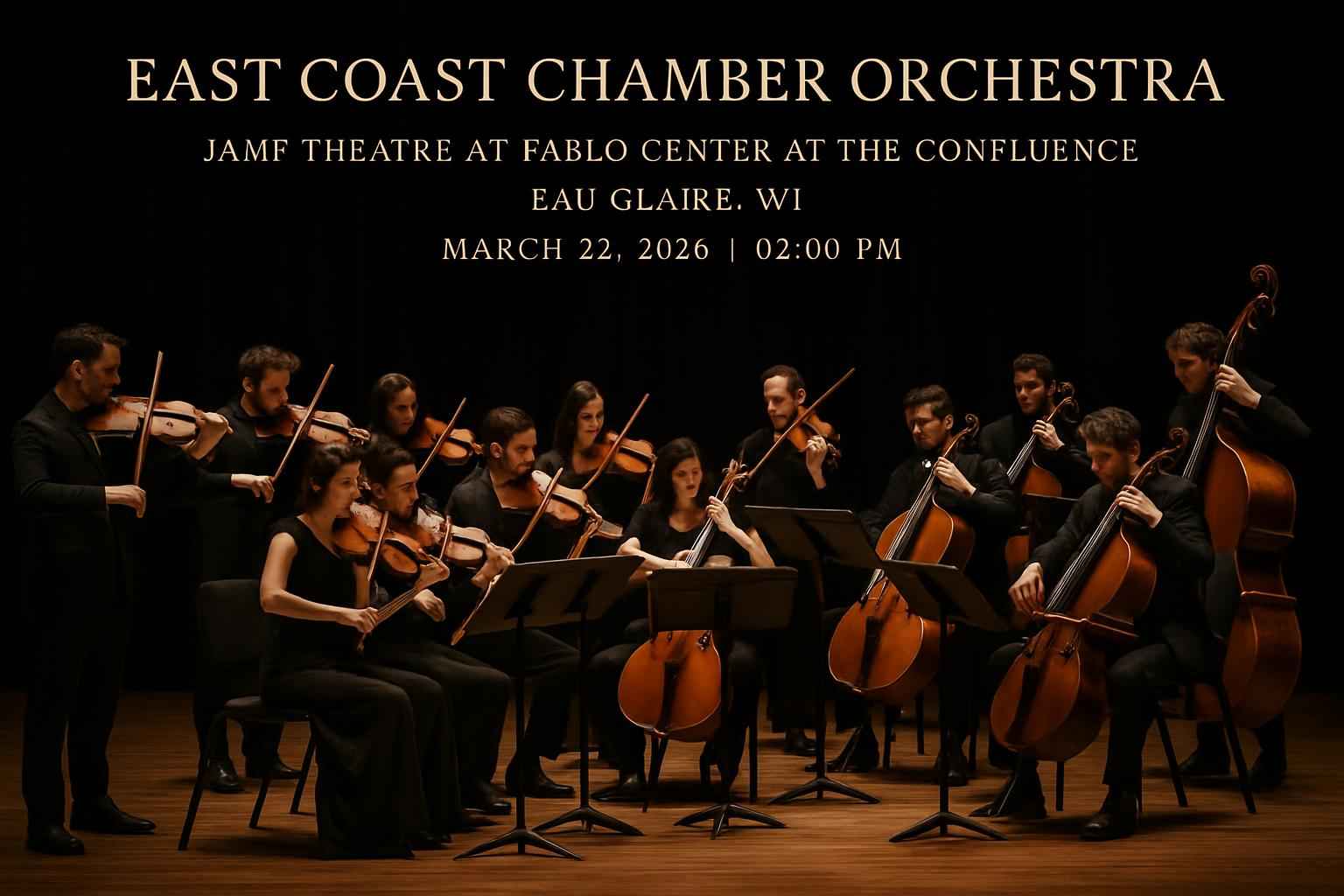 Experience the acclaimed East Coast Chamber Orchestra live at Jamf Theatre At Pablo Center at the Confluence in Eau Claire WI on March 22 2026 at 2 PM. This highly anticipated classical music event brings renowned musicians to the heart of Eau Claire delivering a powerful performance known for its artistry and energy. Secure your spot with exclusive RSVP Event Agency promo codes for discounted tickets. Enjoy premium seats and savings when you reserve your place at this top Eau Claire music event today.