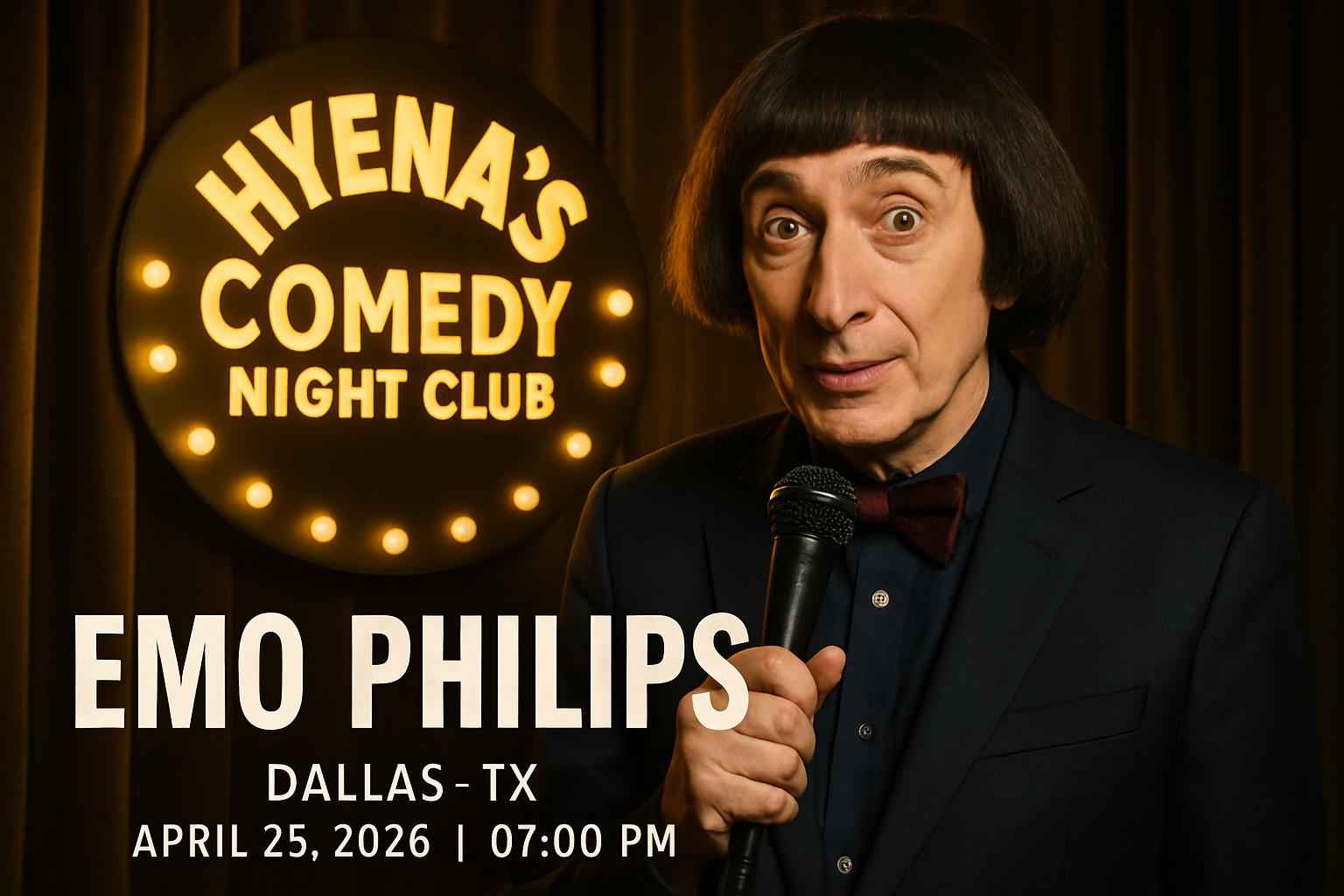 Catch the legendary Emo Philips performing live at Hyenas Comedy Night Club Dallas TX. The event starts at 7 PM on April 25 2026 and brings Philips unique comedic style to one of Dallas top comedy venues. Located in the heart of Dallas this club offers an intimate setting for comedy fans. Plan your visit early to guarantee your spot and discover why this Dallas comedy show is a must-see.