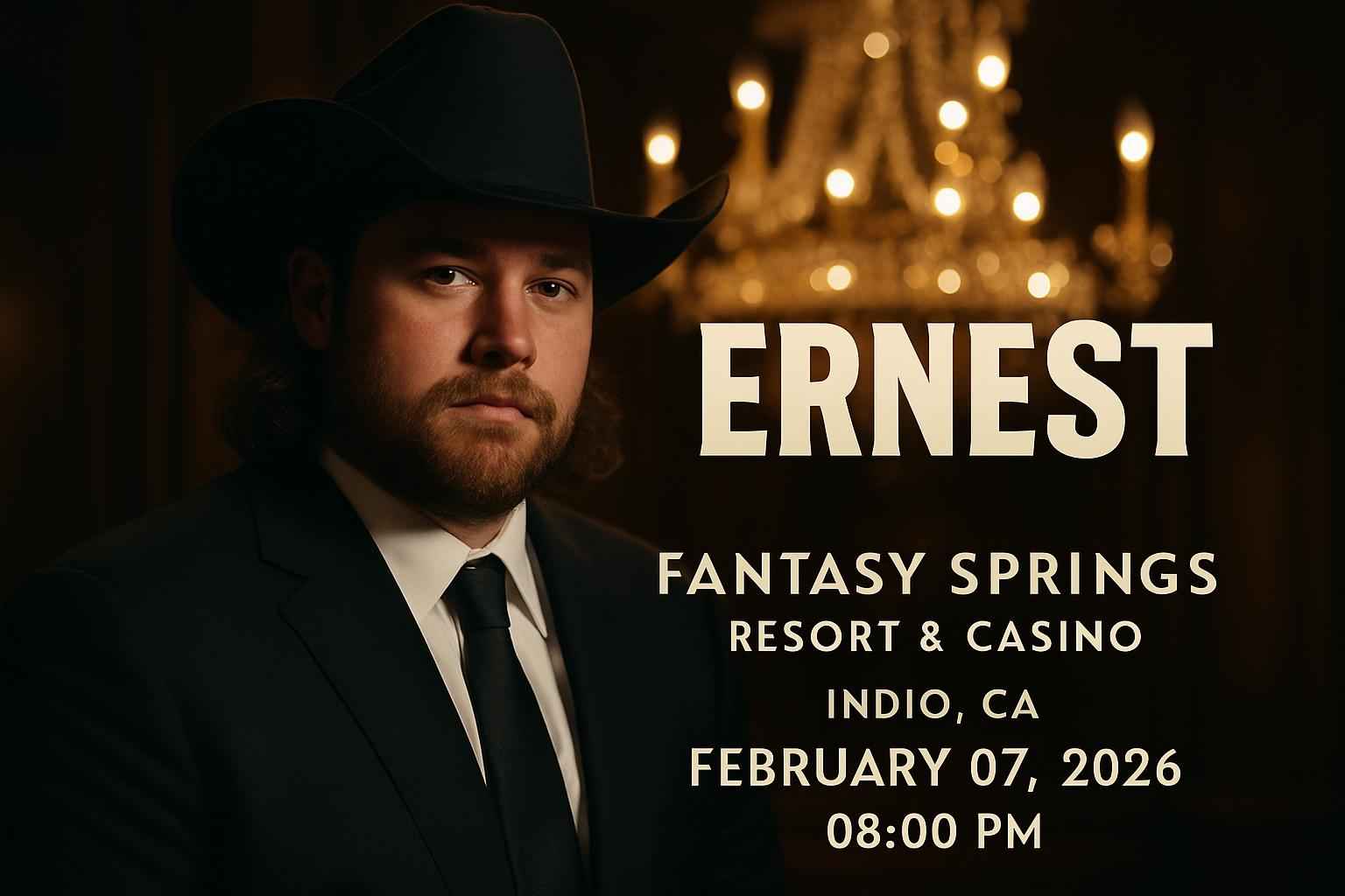 Ernest brings his chart-topping country hits to Fantasy Springs Resort Casino located at 84245 Indio Springs Pkwy Indio CA 92203. Doors open at 7 PM and the show begins at 8 PM. Expect a high-energy evening with top sound and lighting. Fantasy Springs offers free parking and a range of dining options for concertgoers.
