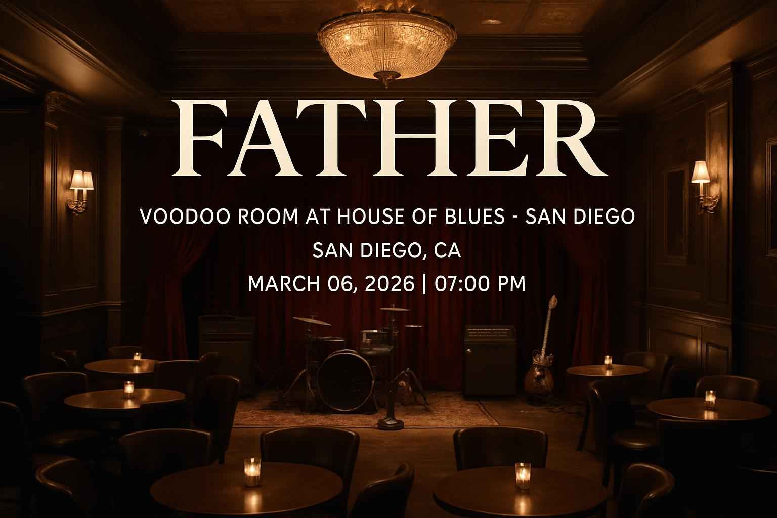 Father performs at the Voodoo Room, House of Blues San Diego, CA, on Friday, March 06, 2026, at 7:00 PM. The Voodoo Room is known for intimate acoustics and a unique atmosphere, making every seat close to the stage. Located near San Diego Gaslamp Quarter, this premier concert offers fans a chance to connect with live music in a renowned small venue.
