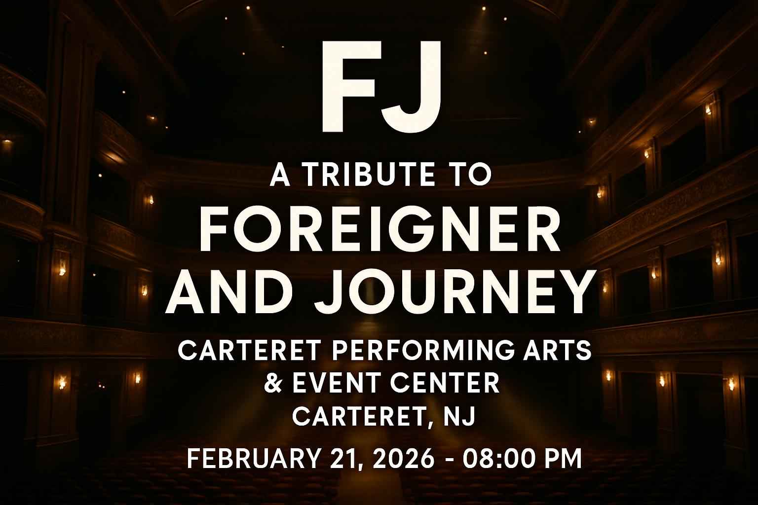 The FJ Tribute concert features a setlist packed with Foreigner and Journey favorites performed live at Carteret Performing Arts & Event Center on February 21 2026. Doors open at 7 PM and the show starts at 8 PM. Located in the heart of Carteret NJ this venue offers easy access for Middlesex County fans and visitors looking for the best local event experience. Enjoy comfortable seating state-of-the-art sound and parking on site.