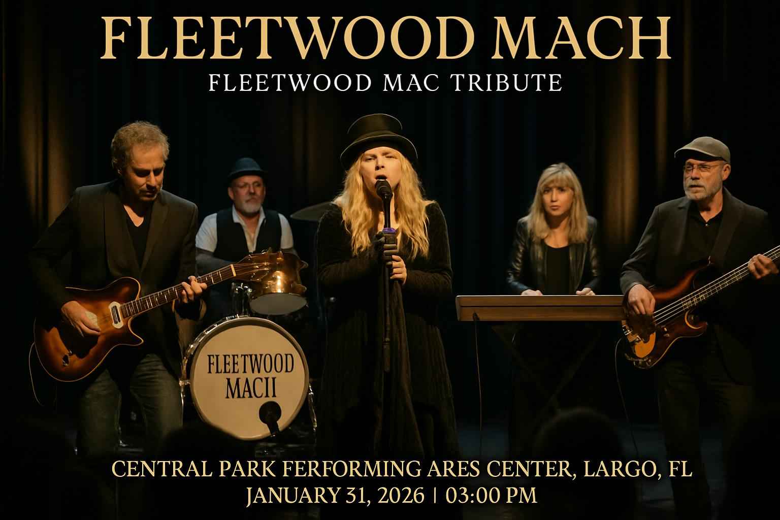 Fleetwood Mach delivers an authentic Fleetwood Mac concert experience featuring timeless hits like Go Your Own Way Rhiannon and The Chain. The Central Park Performing Arts Center in Largo FL offers premier acoustics and a vibrant atmosphere making it a top destination for live music events near Clearwater and St Petersburg. Doors open at 7 PM for this one-night-only tribute show on January 31 2026.