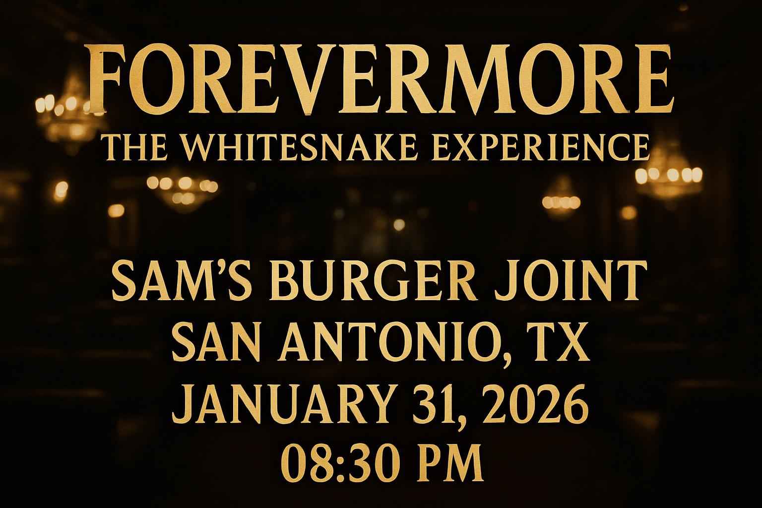 Forevermore – The Whitesnake Experience delivers an authentic Whitesnake concert atmosphere for fans across San Antonio and Texas. The show takes place at Sams Burger Joint a top-rated local venue known for its vibrant live events and great food. Doors open at 0730 PM with the show starting at 0830 PM on January 31 2026. This is your chance to hear legendary tracks performed live close to home.