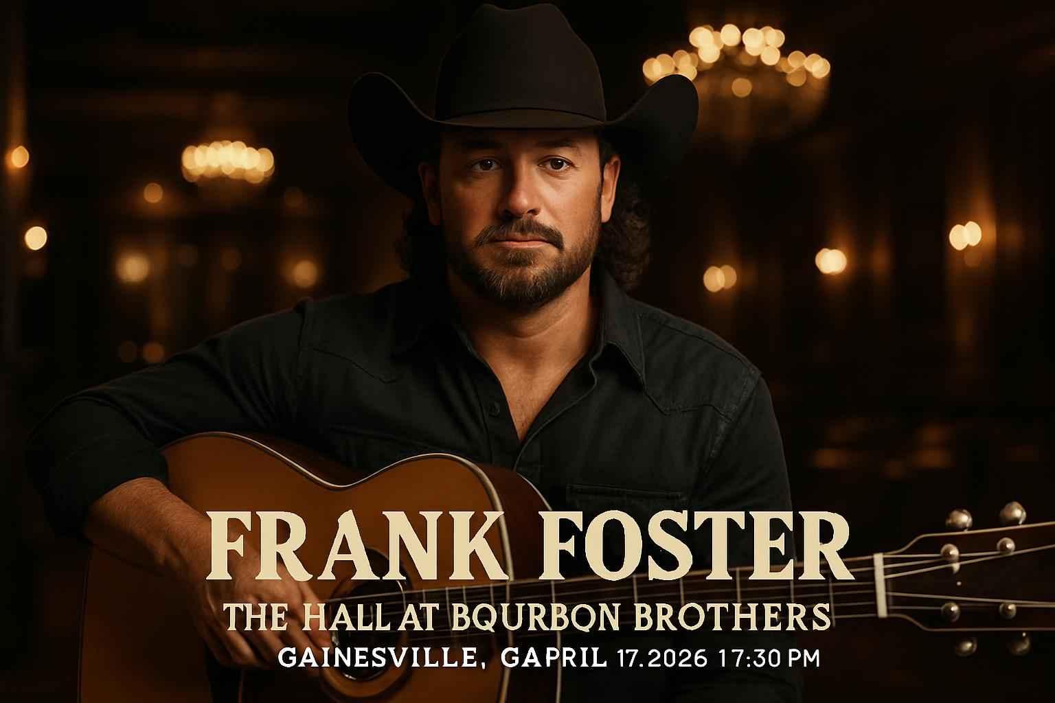 The Hall at Bourbon Brothers in Gainesville offers an inviting atmosphere for fans seeking premium acoustics and a welcoming local crowd. Frank Foster brings a mix of country rock and heartfelt storytelling to the stage with chart-topping hits and fan favorites. Doors open at 0630 PM and the concert begins at 0730 PM. This event is a top choice for Gainesville GA live music and concert experiences in spring 2026.