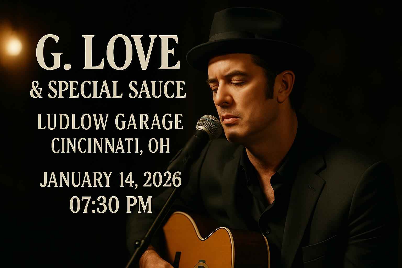 G Love and Special Sauce will perform live at Ludlow Garage in Cincinnati Ohio on January 14 2026 at 0730 PM. Secure the best seats and access exclusive G Love and Special Sauce Ludlow Garage coupon codes today from RSVP Event Agency. Elevate your concert experience with savings on verified promo codes and last-minute ticket deals. Discover all essential event details below to plan your perfect live music night in Cincinnati.