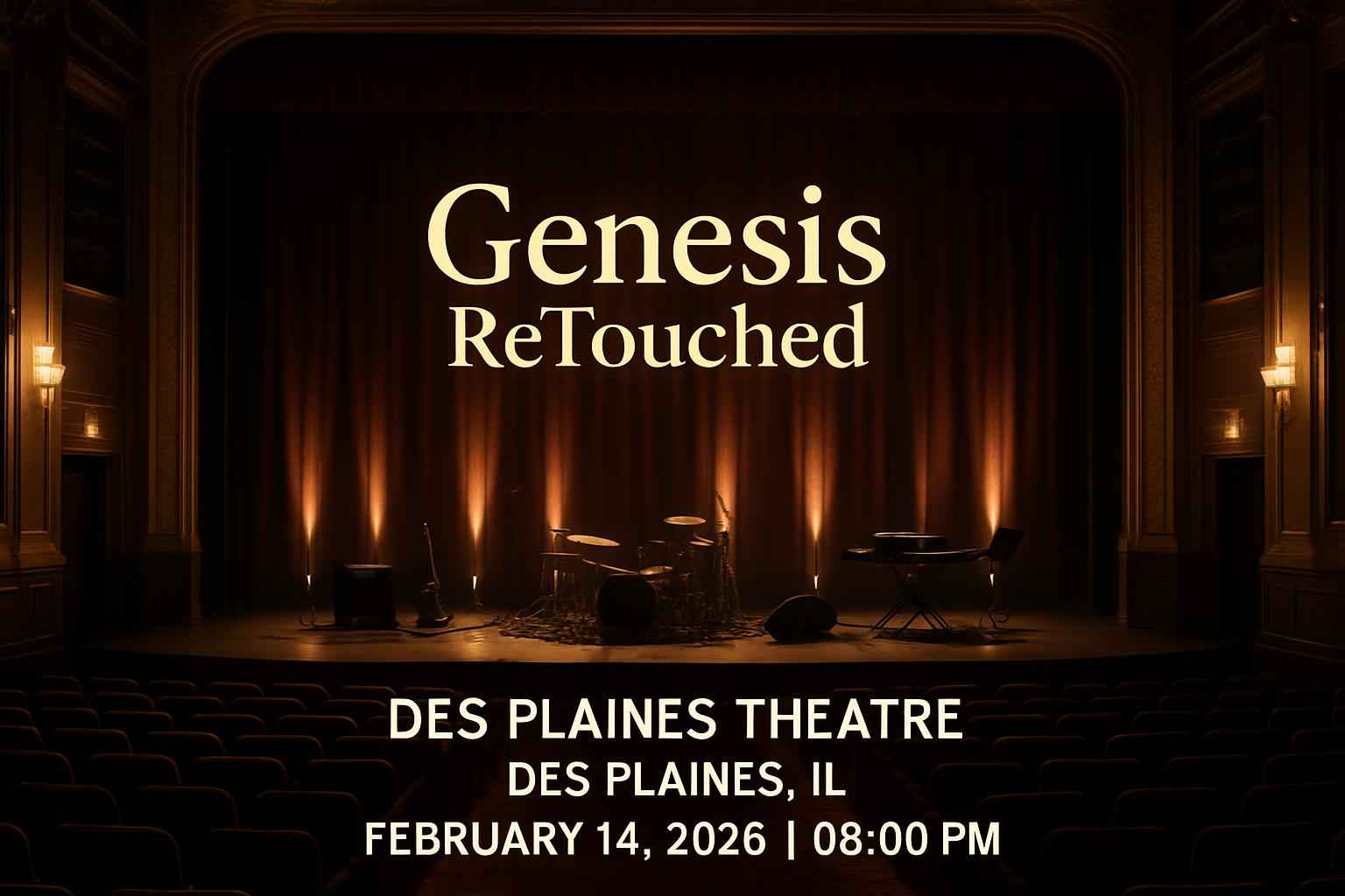 Genesis ReTouched performs a tribute concert featuring classic Genesis hits at Des Plaines Theatre, IL, on February 14, 2026, at 8 PM. Doors open at 7 PM. Secure discounted tickets and exclusive promo codes via RSVP Event Agency for an immersive live music experience in a comfortable, accessible venue. Limited availability—book early to save.