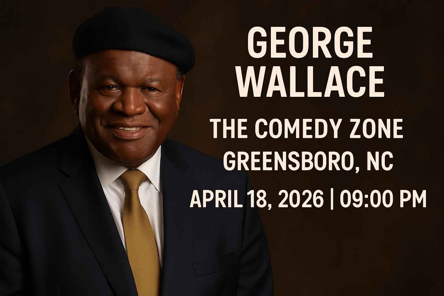 The George Wallace show at Comedy Zone Greensboro starts at 9 PM on April 18 2026 with doors opening at 8 PM.