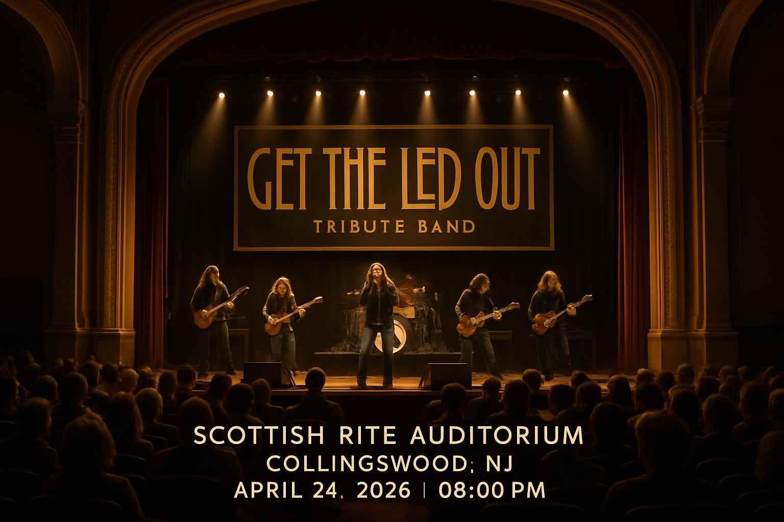 Get The Led Out – Tribute Band brings a celebrated Led Zeppelin experience to Scottish Rite Auditorium located at 315 White Horse Pike Collingswood NJ 08107. Doors open at 7 PM and the show starts at 8 PM. Fans enjoy premium acoustics and historic ambiance at this top South Jersey live music venue. Parking is available nearby and the venue is accessible for guests with mobility requirements. RSVP Event Agency provides verified info and the latest ticket offers for this sought-after 2026 concert.