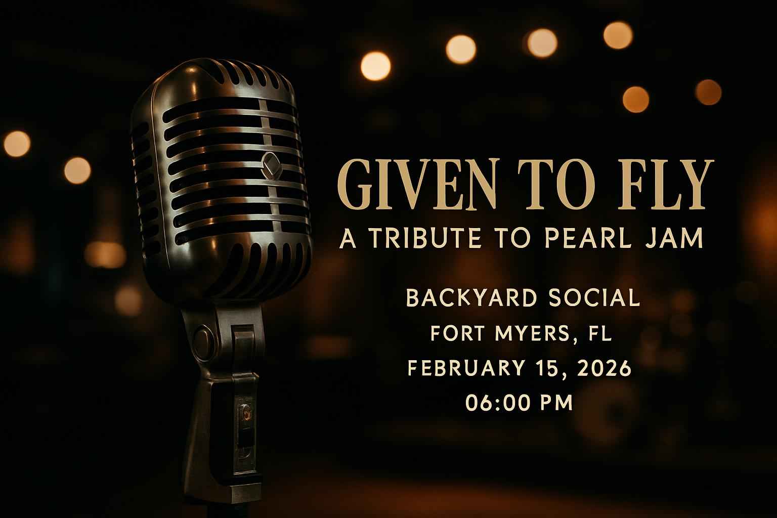 Given to Fly – A Tribute to Pearl Jam brings the Seattle sound to BackYard Social in Fort Myers FL for an unforgettable evening. Doors open at 6 PM on February 15 2026. Enjoy live performances of Pearl Jam favorites with premium sound and an authentic atmosphere. The venue offers convenient parking and top-rated hospitality for music fans across Lee County and Southwest Florida.