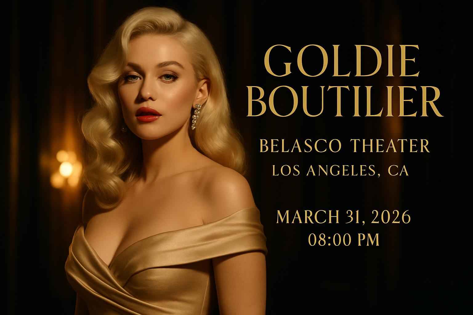 Goldie Boutilier is scheduled to perform at Belasco Theater LA on March 31 2026 with doors opening at 7 PM and the show starting at 8 PM.
