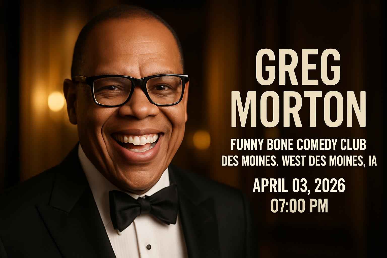 The Greg Morton comedy event takes place on April 03 2026 at 7 PM at Funny Bone Comedy Club in West Des Moines IA.