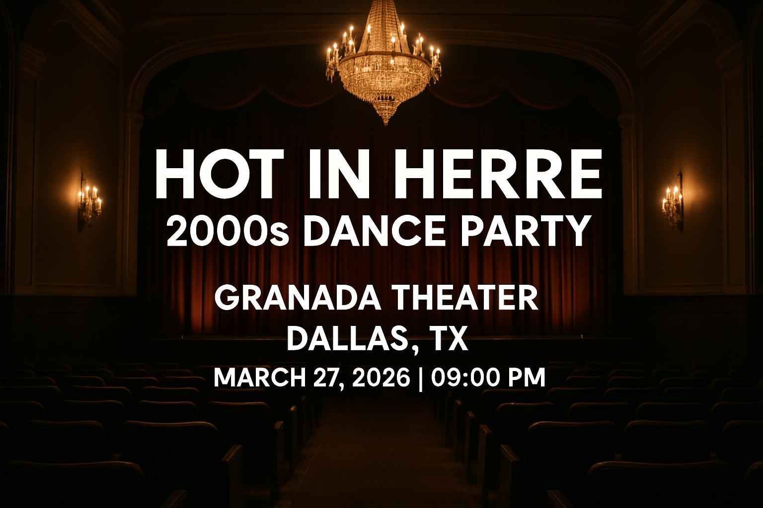 Join Dallas music fans at Granada Theater for the Hot In Herre 2000s Dance Party on March 27 2026. The event starts at 9 PM and features the best 2000s hits from iconic artists and DJs. Granada Theater in Dallas TX is a renowned destination for live music and dance parties. Enjoy easy parking, vibrant nightlife, and a unique 2000s-themed atmosphere.