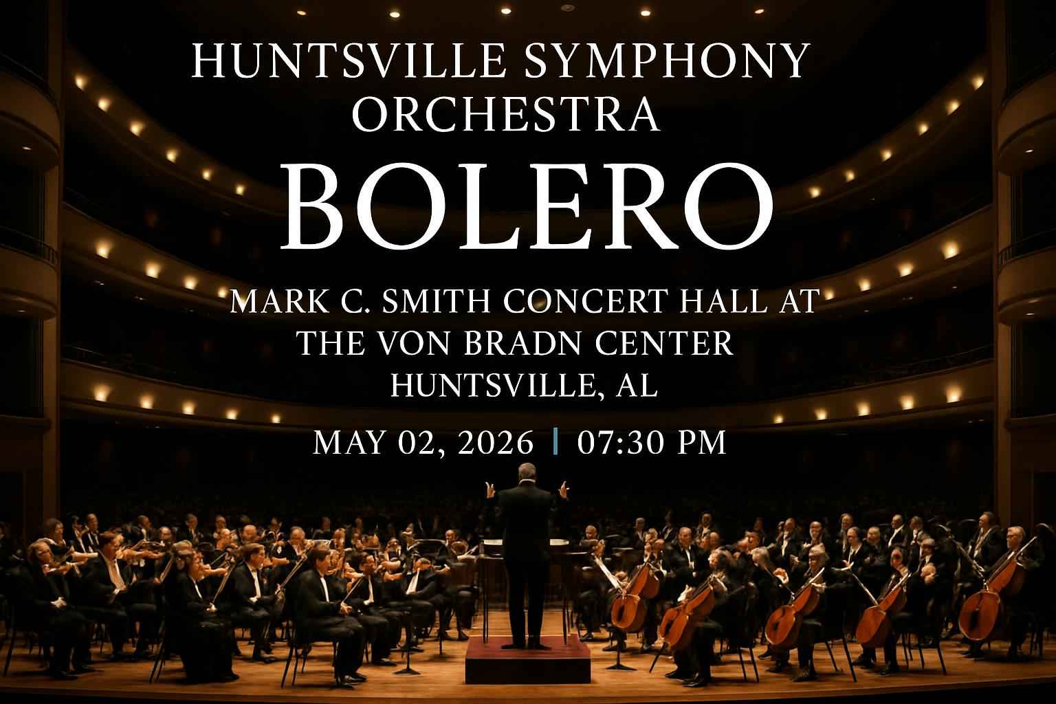 Experience a captivating evening with the Huntsville Symphony Orchestra Bolero at the Mark C Smith Concert Hall at the Von Braun Center in Huntsville AL on May 2 2026 at 7:30 PM. Secure exclusive Huntsville Symphony Orchestra Bolero coupon codes from RSVP Event Agency for instant savings on tickets. Enjoy world-class music and vibrant local culture while discovering the most trusted promo codes for this highly anticipated orchestra concert.