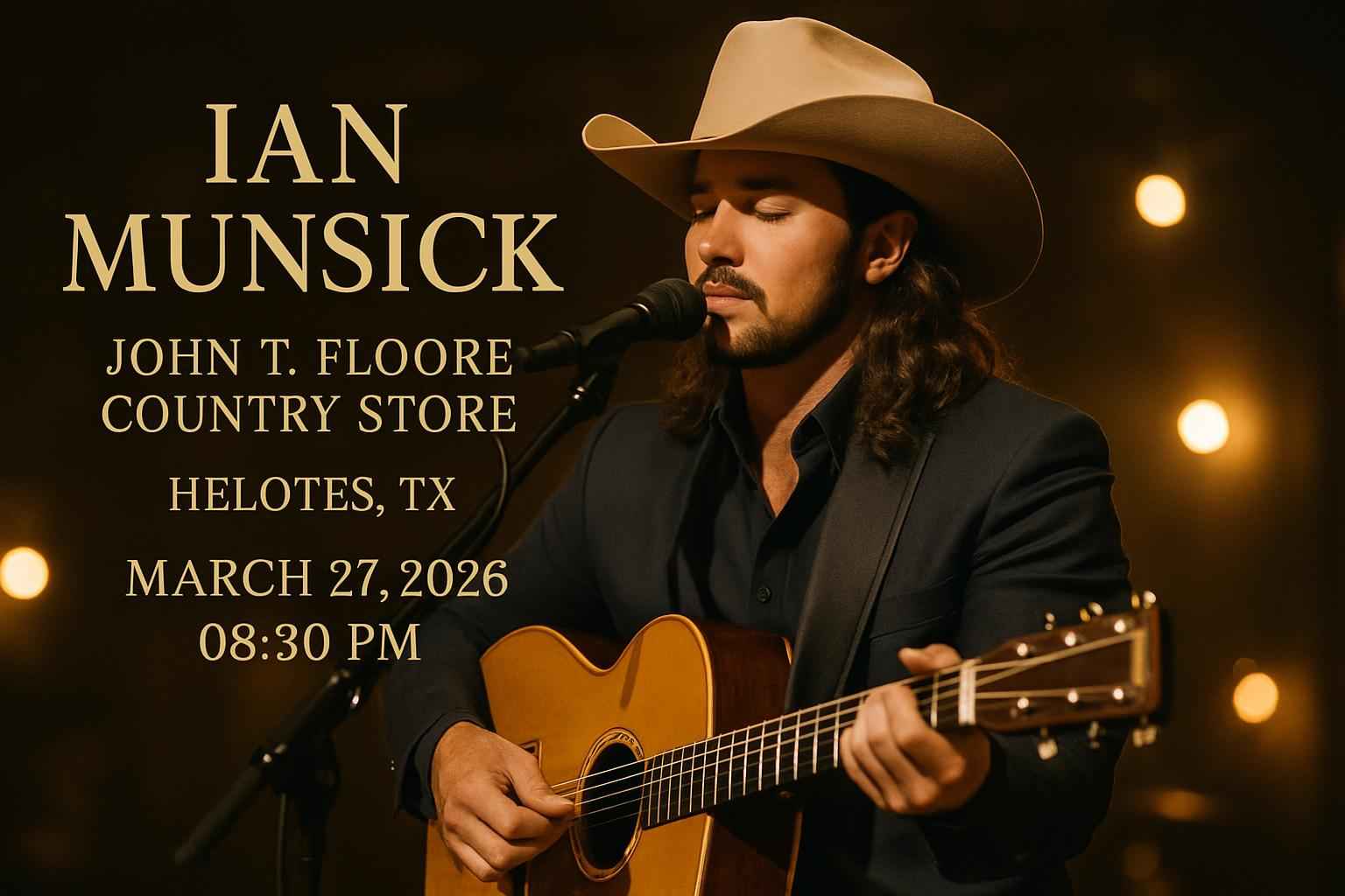 Ian Munsick is scheduled to perform at 0830 PM on March 27 2026 at John T. Floore Country Store in Helotes TX.