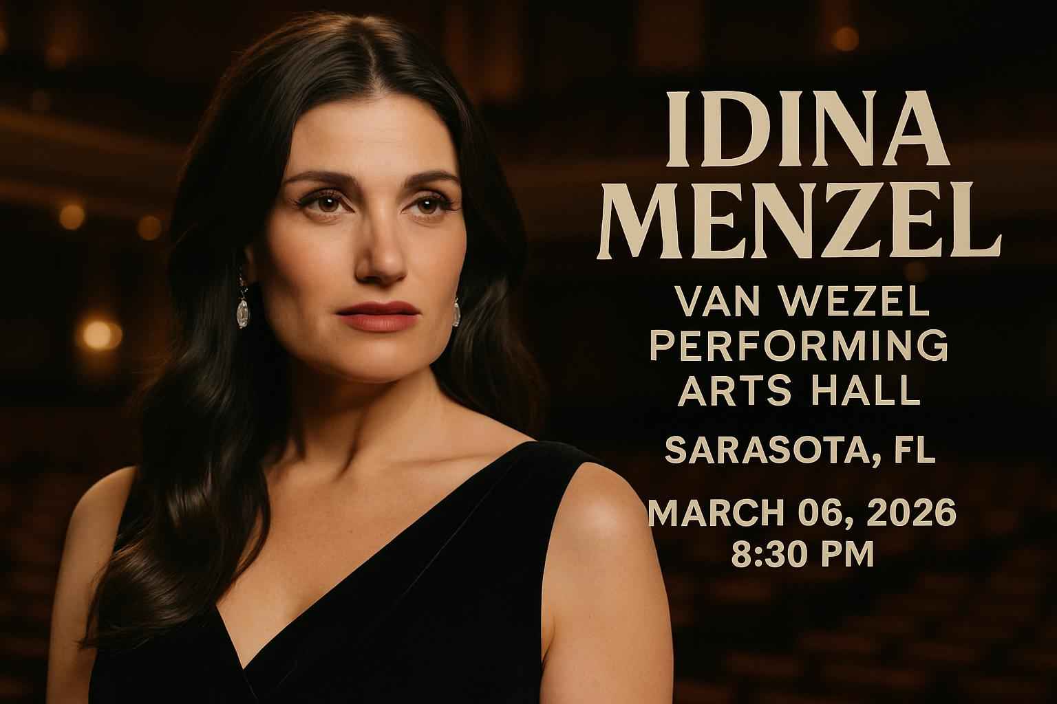 The Idina Menzel concert at Van Wezel Performing Arts Hall Sarasota FL begins at 8:30 PM on March 6 2026.
