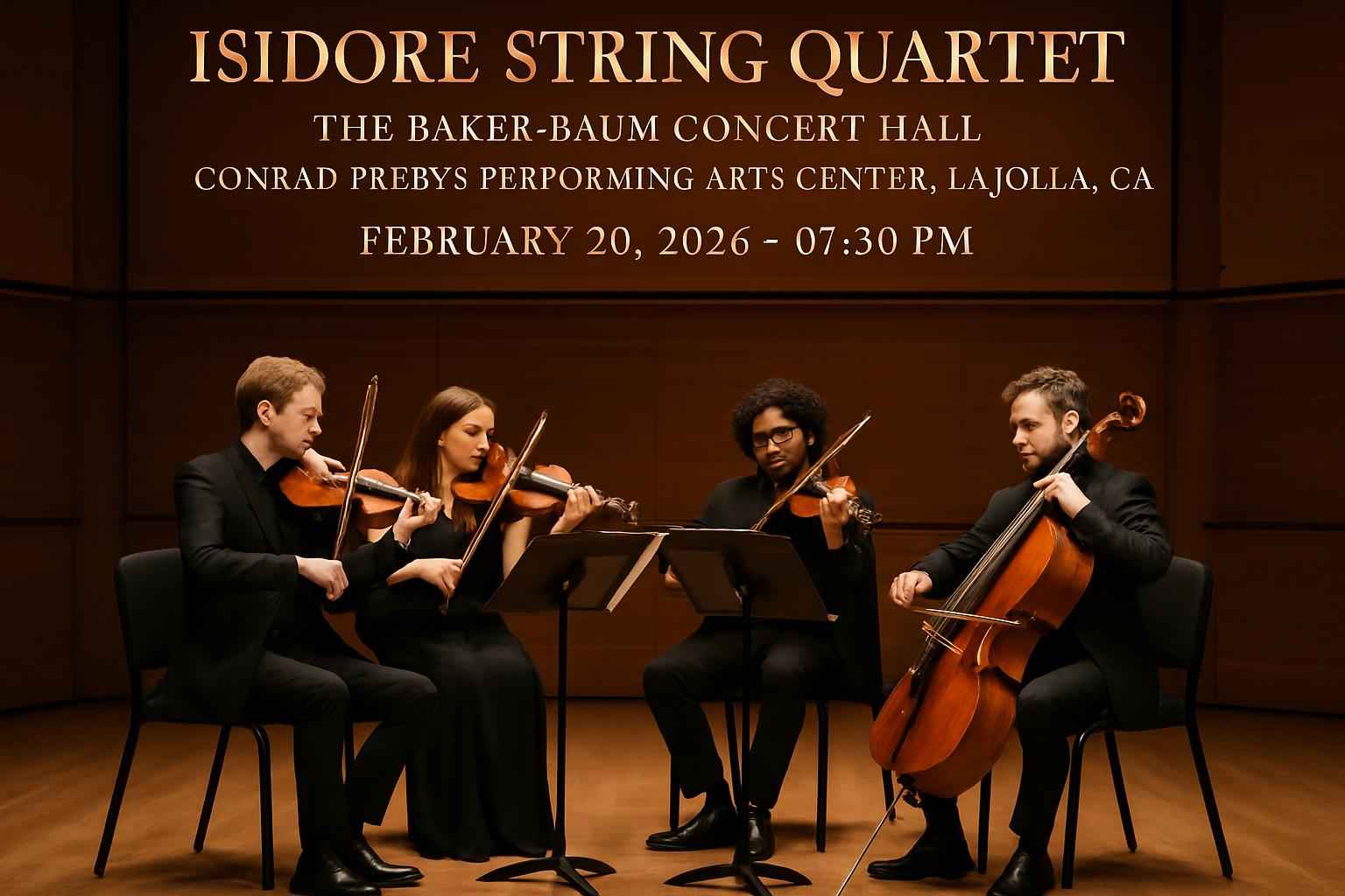 The acclaimed Isidore String Quartet performs live at The Baker-Baum Concert Hall, Conrad Prebys Performing Arts Center, La Jolla, on February 20, 2026, at 7:30 PM. RSVP Event Agency offers exclusive promo codes and discounts for premium seats. Enjoy an intimate, world-class chamber music experience with easy parking and group offers in San Diego’s vibrant arts scene.