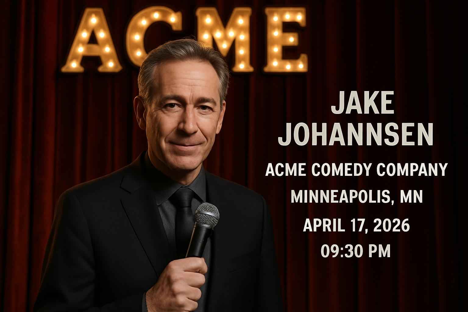 Jake Johannsen brings his signature wit and storytelling to Acme Comedy Company one of Minneapolis top stand-up venues. The event starts at 0930 PM on April 17 2026 with doors opening early for premium seating. Enjoy a night of laughter with a nationally acclaimed comedian and take advantage of special ticket promotions for this exclusive Minneapolis comedy event.