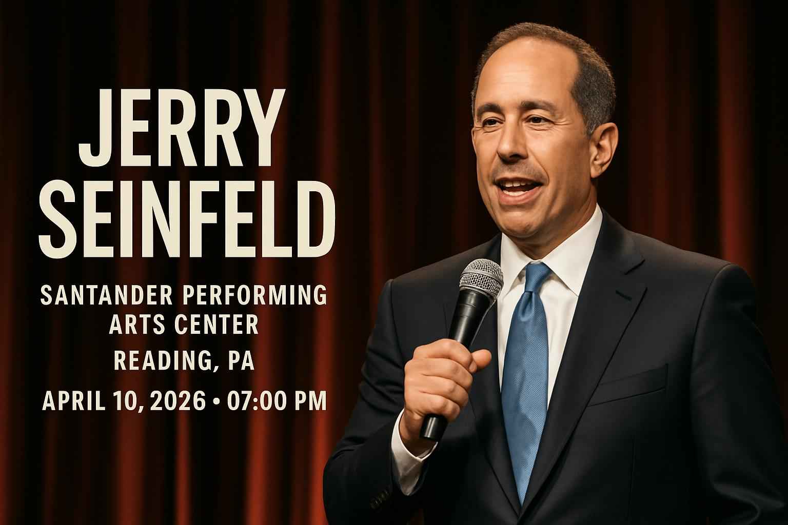 Jerry Seinfeld brings his signature observational humor to Santander Performing Arts Center in Reading Pennsylvania. This April 2026 event promises memorable moments and laughter for fans of all ages. Doors open at 6:00 PM giving guests plenty of time to enjoy local dining and entertainment nearby. The venue is located at 136 North 6th Street Reading PA making it easy to access from anywhere in Berks County or greater Philadelphia.