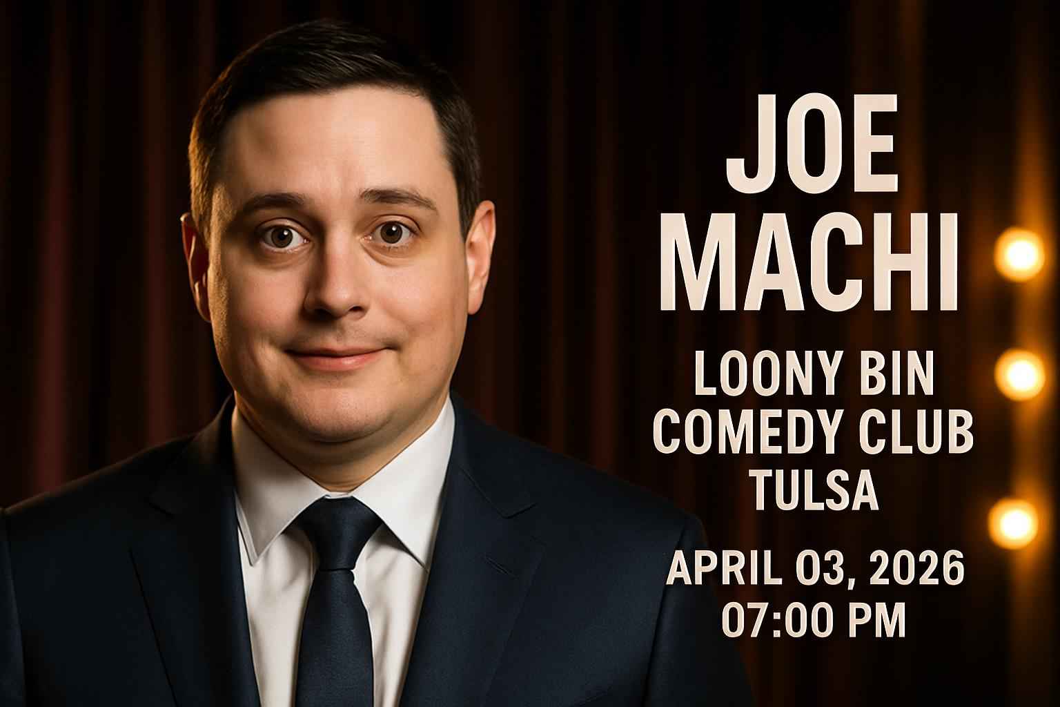 Experience Joe Machi live at Loony Bin Comedy Club in Tulsa OK on April 03 2026 at 7 PM. This special comedy event draws fans searching for exclusive ticket discounts and event details. RSVP Event Agency delivers the best Joe Machi coupon codes and up-to-date event info for Tulsa comedy nights. Secure your seats and enjoy a memorable evening with Joe Machi at one of Tulsa’s top comedy venues.