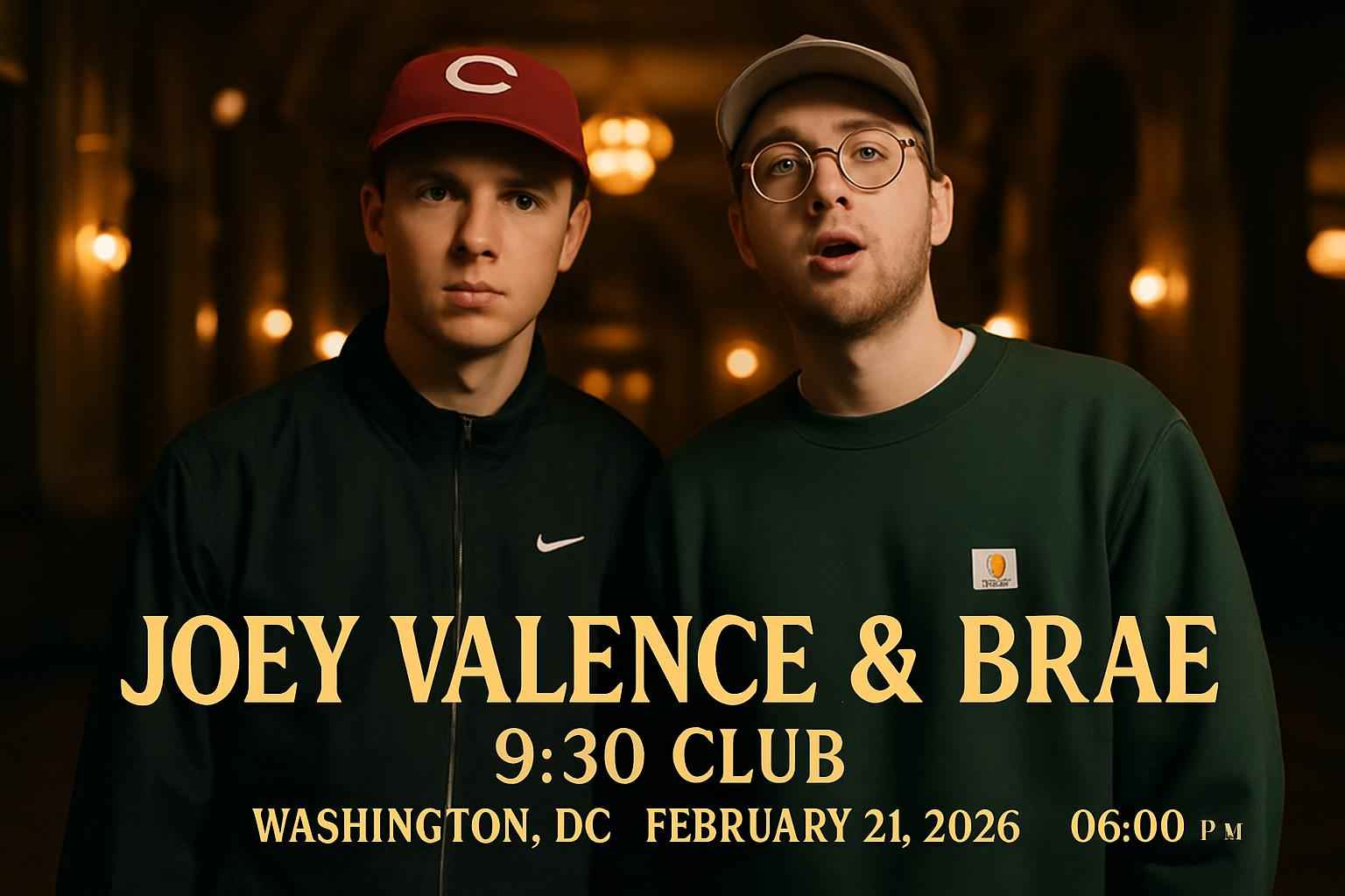 Joey Valence and Brae bring their viral hip hop sound to the iconic 9-30 Club in Washington DC. Doors open at 6 PM on February 21 2026 offering fans a unique live performance experience with top-tier lighting and sound. The 9-30 Club is known for its intimate atmosphere and central DC location making it a top destination for live music fans and visitors.