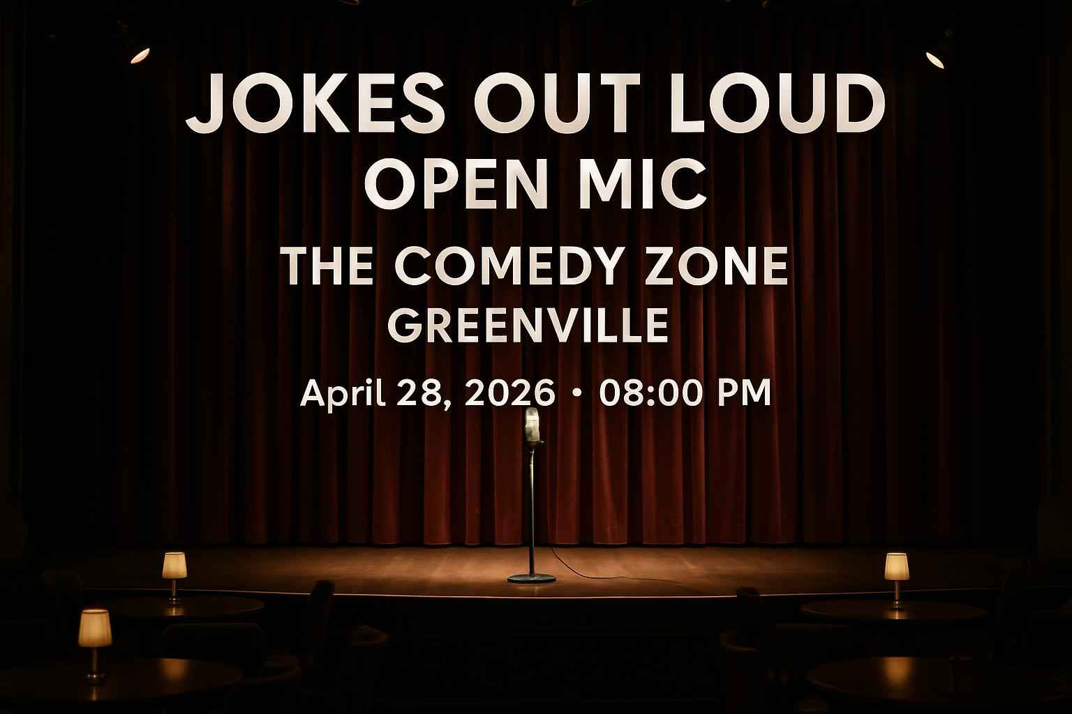 Jokes Out Loud Open Mic takes place at The Comedy Zone located in downtown Greenville South Carolina. Scheduled for April 28 2026 at 8:00 PM this event is ideal for fans searching for live comedy shows near me or open mic nights in Greenville. Doors open early for premium seating and the venue features a full food and drink menu. Plan your visit today and enjoy a memorable comedy night in the Upstate.