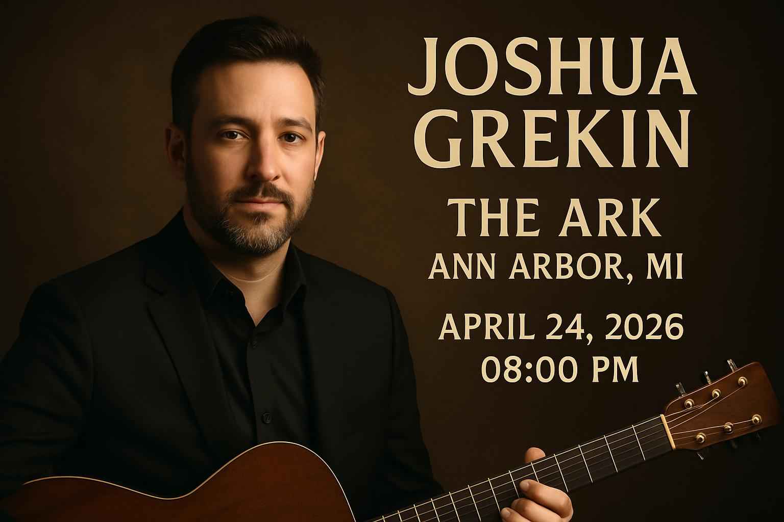 Joshua Grekin will perform at The Ark in downtown Ann Arbor on Friday April 24 2026 starting at 8 PM. The Ark is recognized for its intimate atmosphere and world-class acoustics attracting music lovers from across Washtenaw County and southeast Michigan. Convenient parking and nearby dining make this venue a top choice for a night out in Ann Arbor.