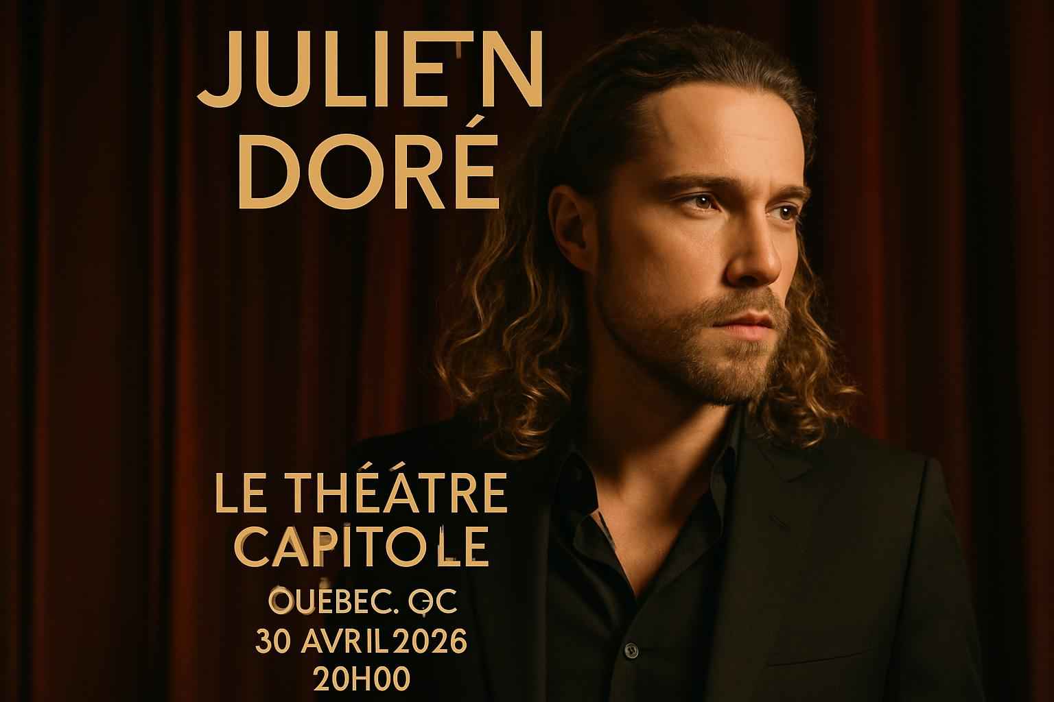 Julien Dore brings his celebrated tour to Le Theatre Capitole Quebec on April 30 2026. The venue is renowned for its intimate setting and exceptional acoustics making it a favorite for live music events in Quebec City. Doors open at 7:00 PM. The show begins at 8:00 PM. Tickets are in high demand for this exclusive Quebec concert experience.