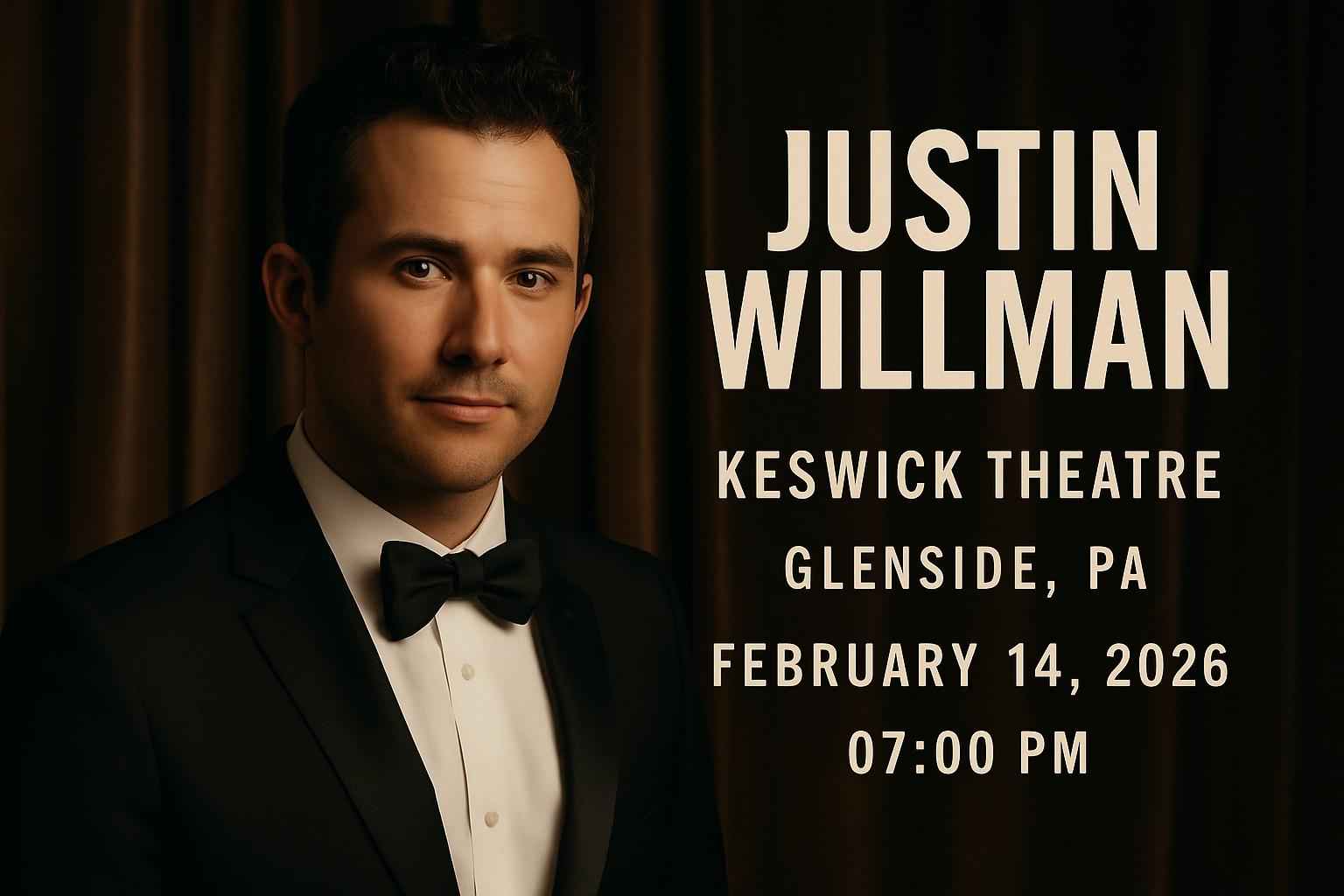 The Justin Willman performance begins promptly at 7 PM on February 14 2026 at Keswick Theatre in Glenside PA Early arrival is recommended for best seating and parking