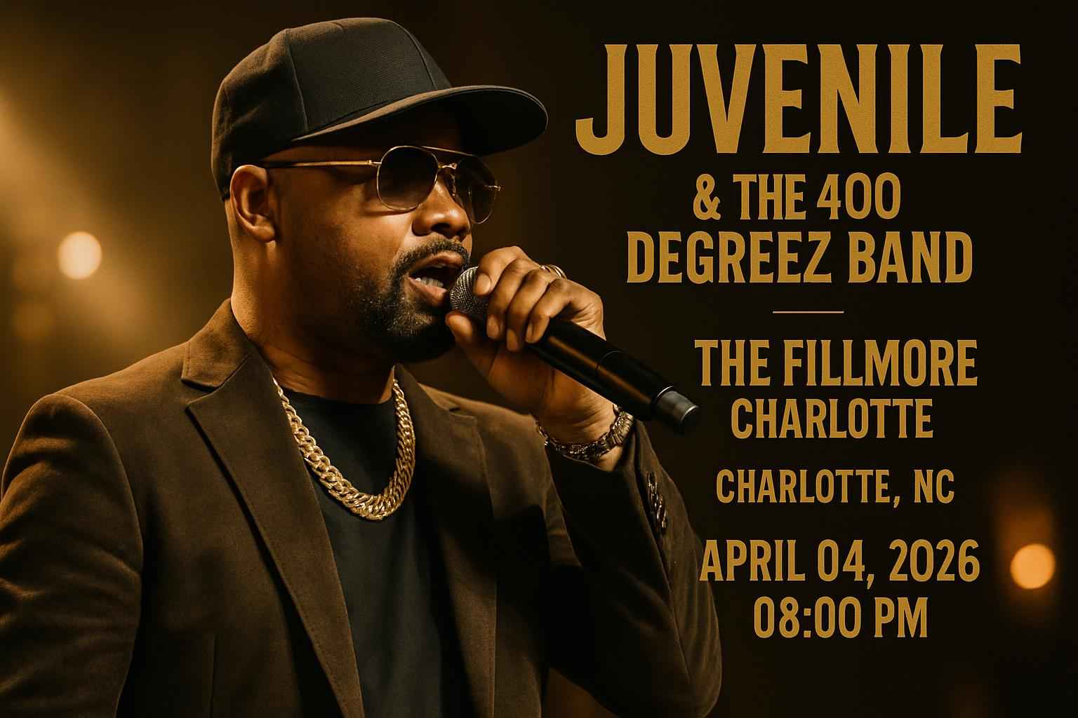 Juvenile and The 400 Degreez Band perform live at The Fillmore Charlotte located at 820 Hamilton Street Charlotte NC 28206. This event takes place on Saturday April 4 2026 with doors opening at 700 PM and the concert starting at 800 PM. Expect an electrifying setlist featuring hits like Back That Azz Up and Slow Motion. The Fillmore Charlotte is known for its prime acoustics and vibrant concert atmosphere making it a top choice for live shows in Charlotte.