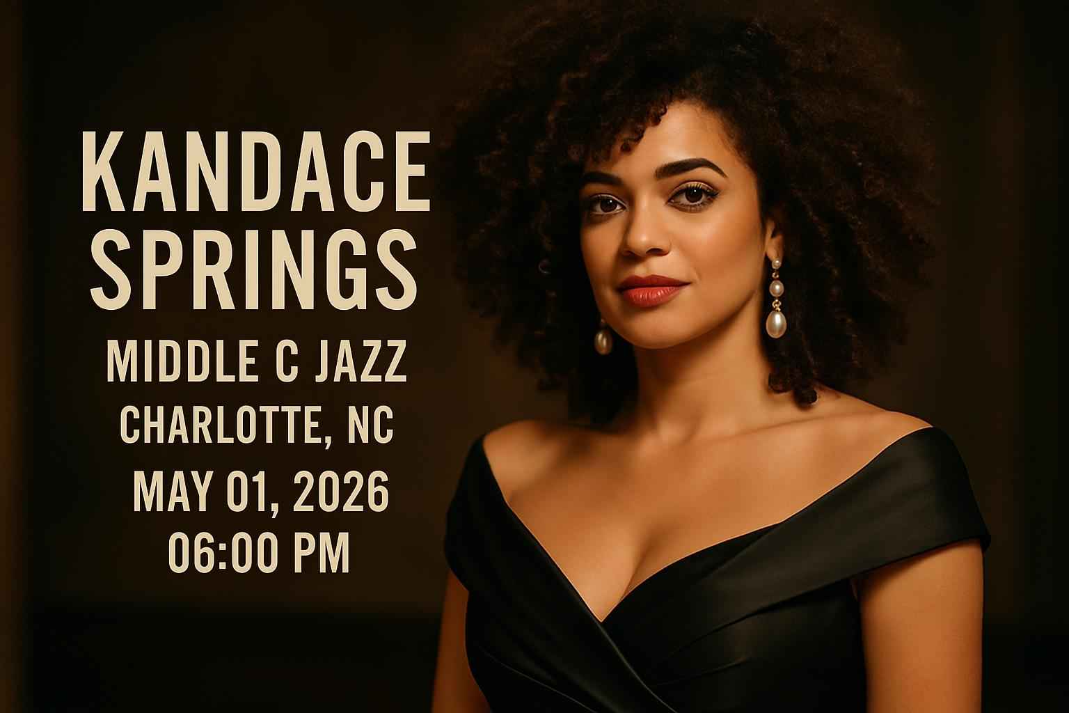 The Kandace Springs concert at Middle C Jazz Charlotte begins at 6:00 PM on May 1 2026 with doors opening at 5:00 PM.