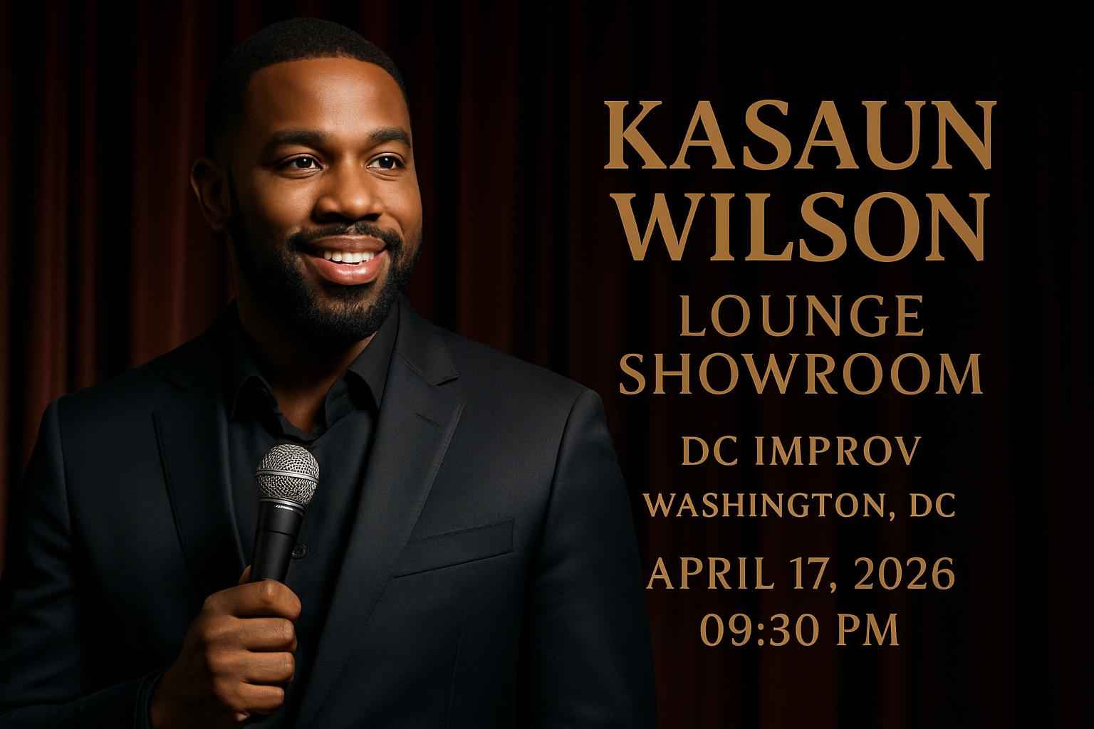 The Kasaun Wilson Lounge Showroom performance begins at 930 PM with doors opening at 9 PM at DC Improv in Washington DC.