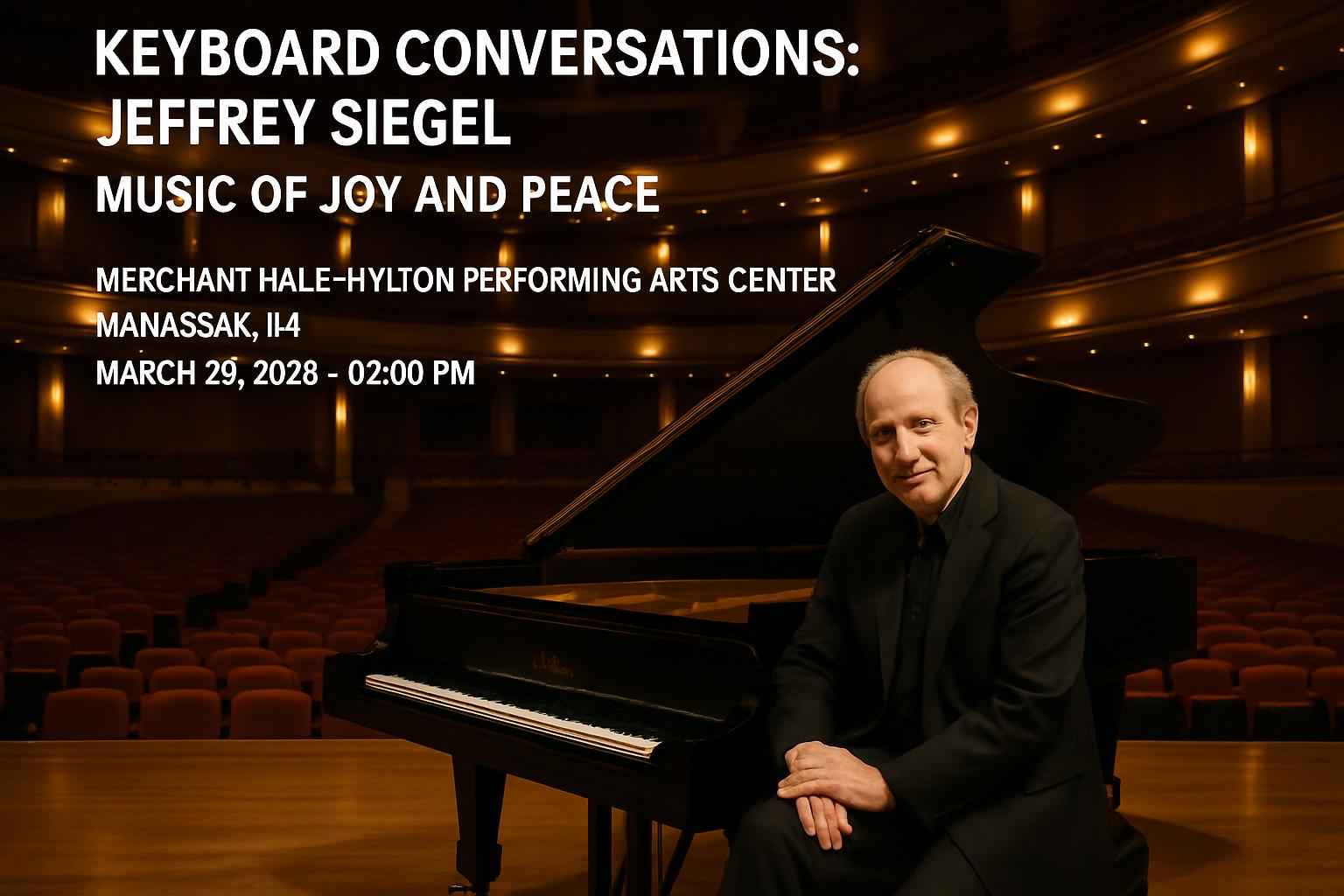 Keyboard Conversations Jeffrey Siegel Music of Joy and Peace showcases acclaimed pianist Jeffrey Siegel as he performs beloved works focused on joy and peace. The performance at Merchant Hall at Hylton Performing Arts Center in Manassas features beautiful piano selections paired with engaging explanations designed to enrich your musical experience. Local attendees and visiting guests enjoy easy access to this celebrated venue near downtown Manassas.