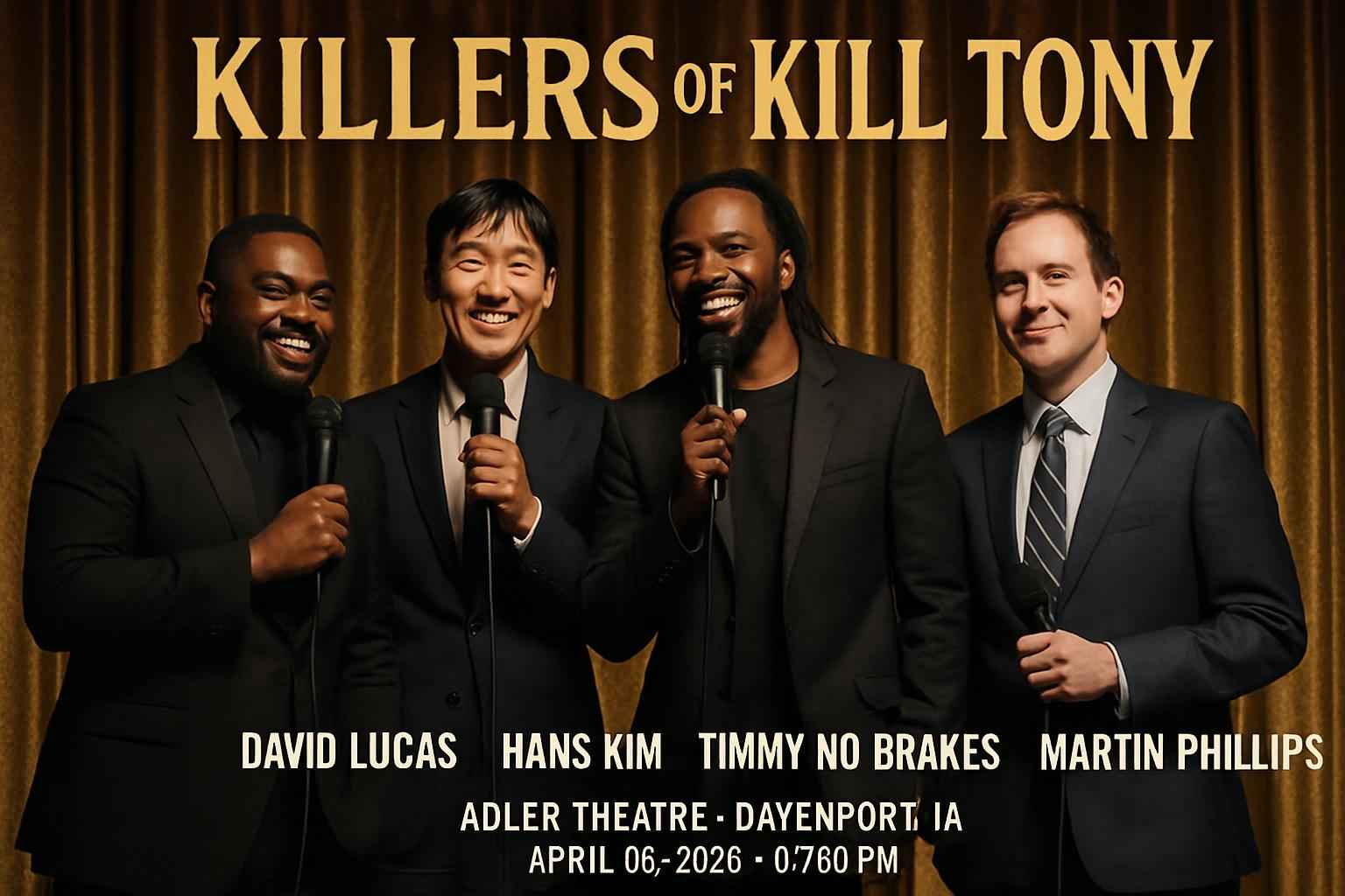 Unlock verified Killers of Kill Tony promo codes for Adler Theatre now. RSVP Event Agency provides top-rated discount codes and early access savings for Killers of Kill Tony: David Lucas, Hans Kim, Timmy No Brakes, and Martin Phillips in Davenport IA. Use a Killers of Kill Tony coupon code at checkout to maximize your savings on event tickets for this exclusive April 2026 comedy show.