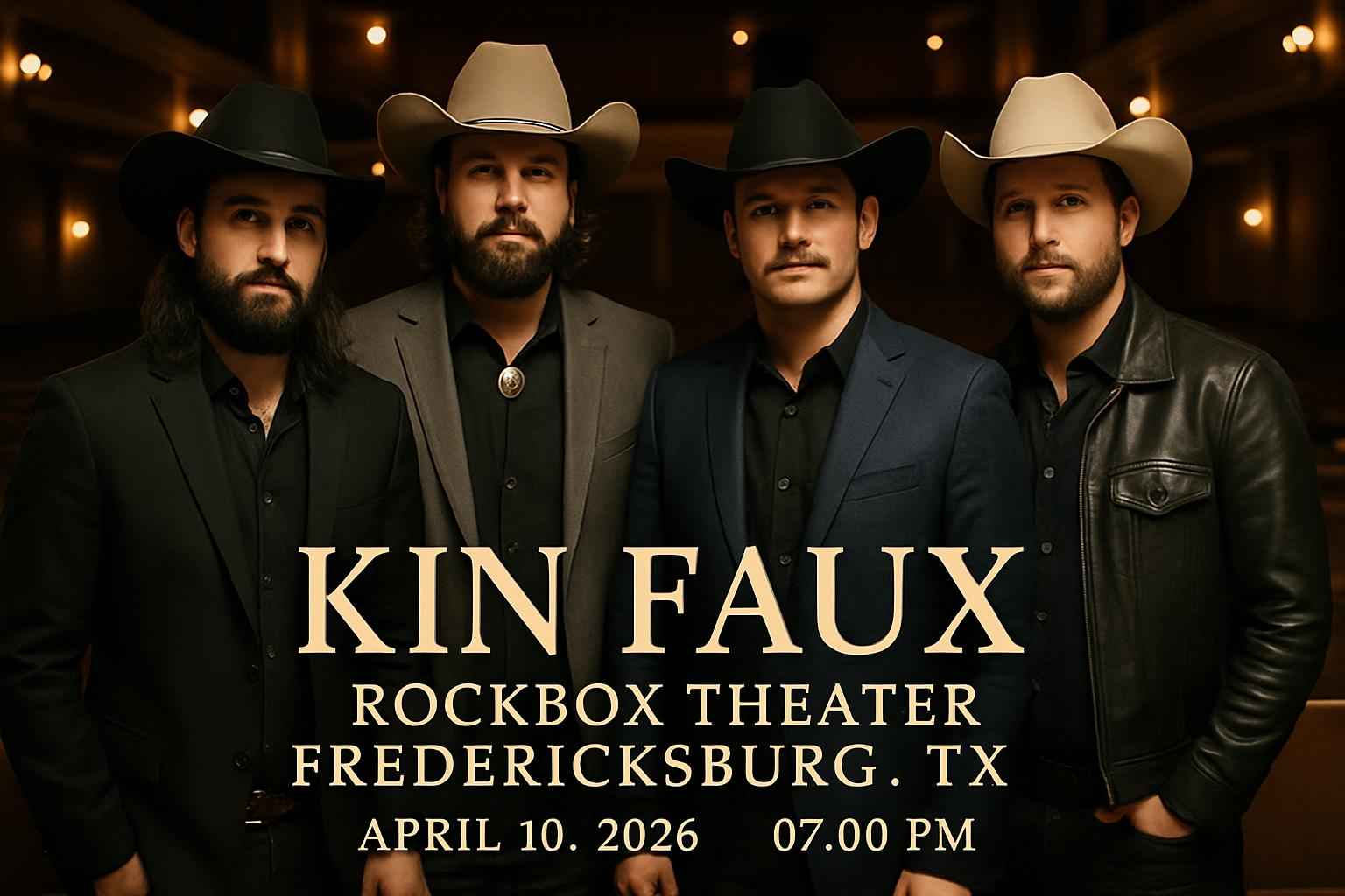 Experience Kin Faux live at Rockbox Theater in Fredericksburg TX on April 10 2026 at 7:00 PM. This exclusive night brings the renowned Texas country band to the heart of the Hill Country. Secure your seat for an unforgettable performance that blends modern country with classic Texas roots. Discover exclusive Kin Faux Rockbox Theater coupon codes through RSVP Event Agency to unlock instant savings on your tickets today.
