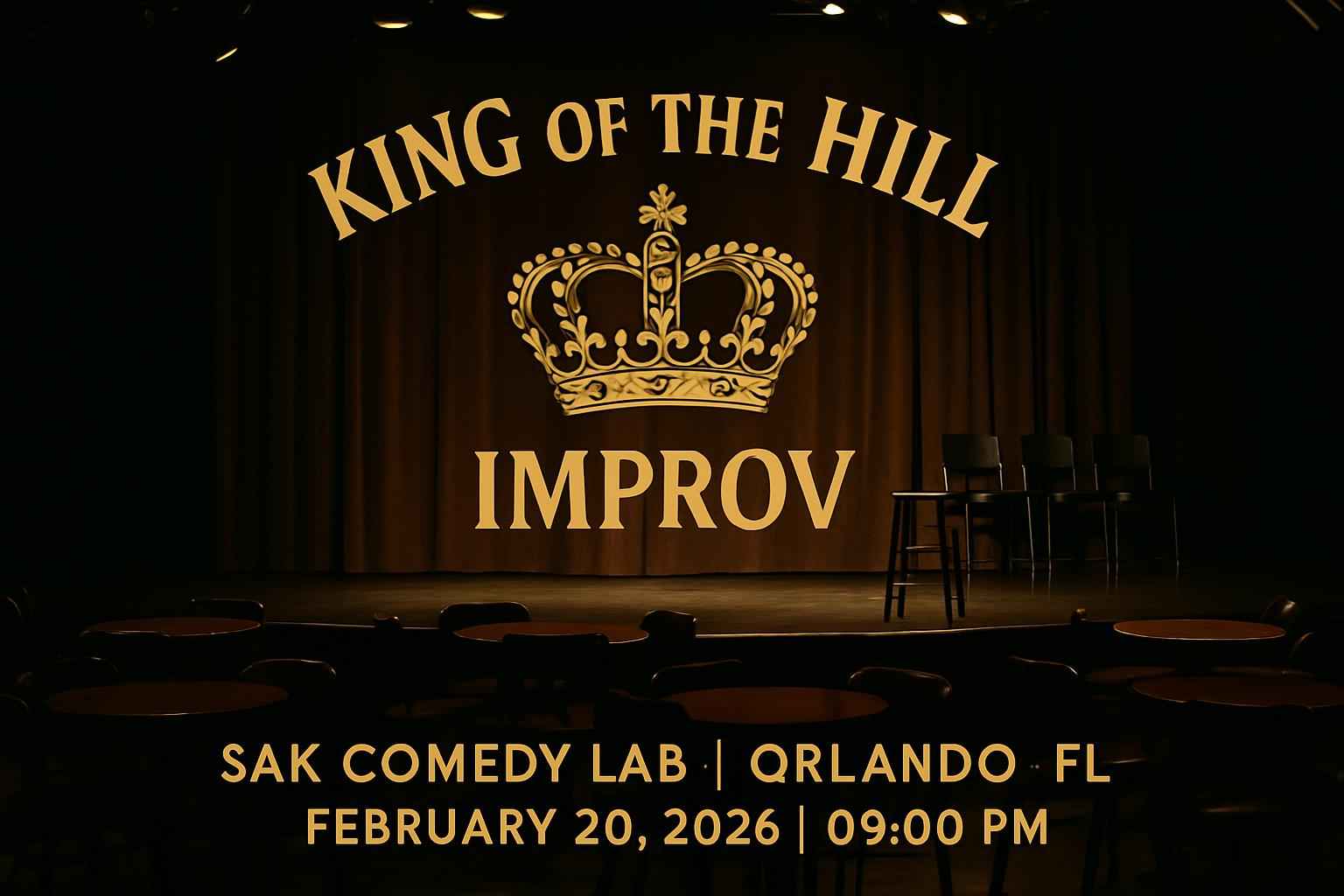 Experience the energy of King of the Hill – Improv at SAK Comedy Lab in Orlando FL on February 20 2026 at 9:00 PM. This top-rated improv comedy event brings together Orlando locals and visitors for an unforgettable night filled with unscripted performances and interactive audience participation. Secure your spot at one of Orlando’s most acclaimed comedy venues and enjoy great savings through exclusive RSVP Event Agency coupons and promo codes.