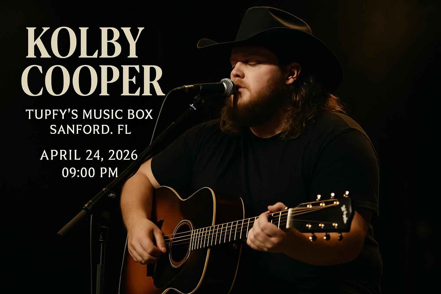 Kolby Cooper brings his signature Texas country sound to Tuffy’s Music Box in Sanford FL. Doors open at 8 PM with the show starting at 9 PM. Tuffy’s Music Box offers free parking and is located in historic downtown Sanford near top restaurants and nightlife. Plan your night and explore Sanford before the show for a complete concert experience.